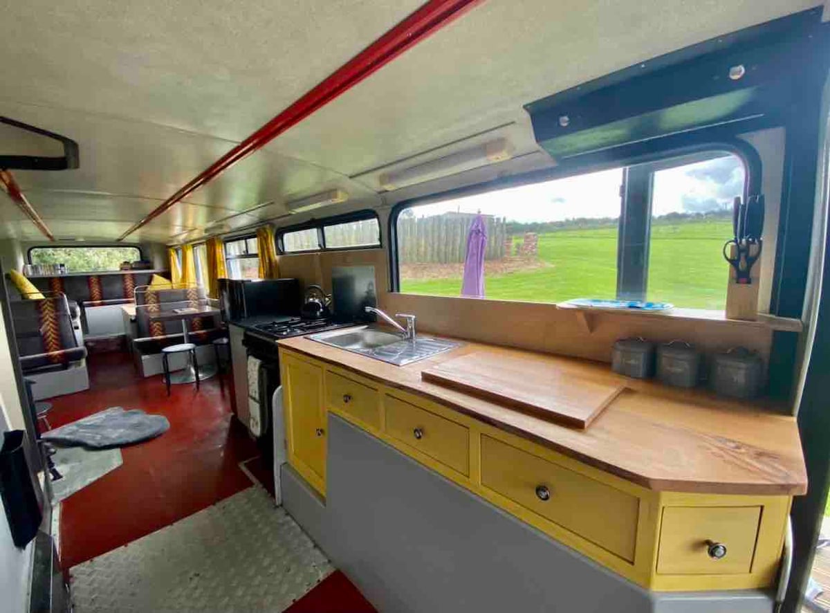 Gladys is onze dubbeldekkerbus, gelegen in een bosrijke baai van het veld met houtgestookt bad. De begane grond heeft een houtkachel, keuken, gasfornuis, koelkast met vriezer, fornuis, waterkoker, doucheruimte via de nooduitgang, tv/dvd-speler (alleen geschikt voor het afspelen van dvd's), originele busfuncties, bestuurdersstoel en busverlichting. De eerste verdieping heeft een dubbele kastbed, een eenpersoonsbed en een slaapkamer met een tweepersoonsbed. Ook inbegrepen USB-laadpunten en 5AMP-stopcontacten, picknickbank en ligstoelen. Twee honden welkom.