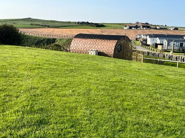 Family Glamping in een Luxury Sea-View Pod met een tweepersoonsbed, een slaapbank met 3 zitplaatsen geschikt voor 2 personen om comfortabel op te slapen en een natte kamer. De Pod is voorzien van dubbele beglazing, volledig geïsoleerd en gas centraal verwarmd, met een magnetron, een gaskookplaat en een koelkast. Ambachtelijk gebouwd door de toonaangevende Pod-fabrikant voor op maat gemaakte specificaties, heeft de pod een eigen ingang en een ononderbroken uitzicht op zee met een overdekte eethoek en een eigen bubbelbad.