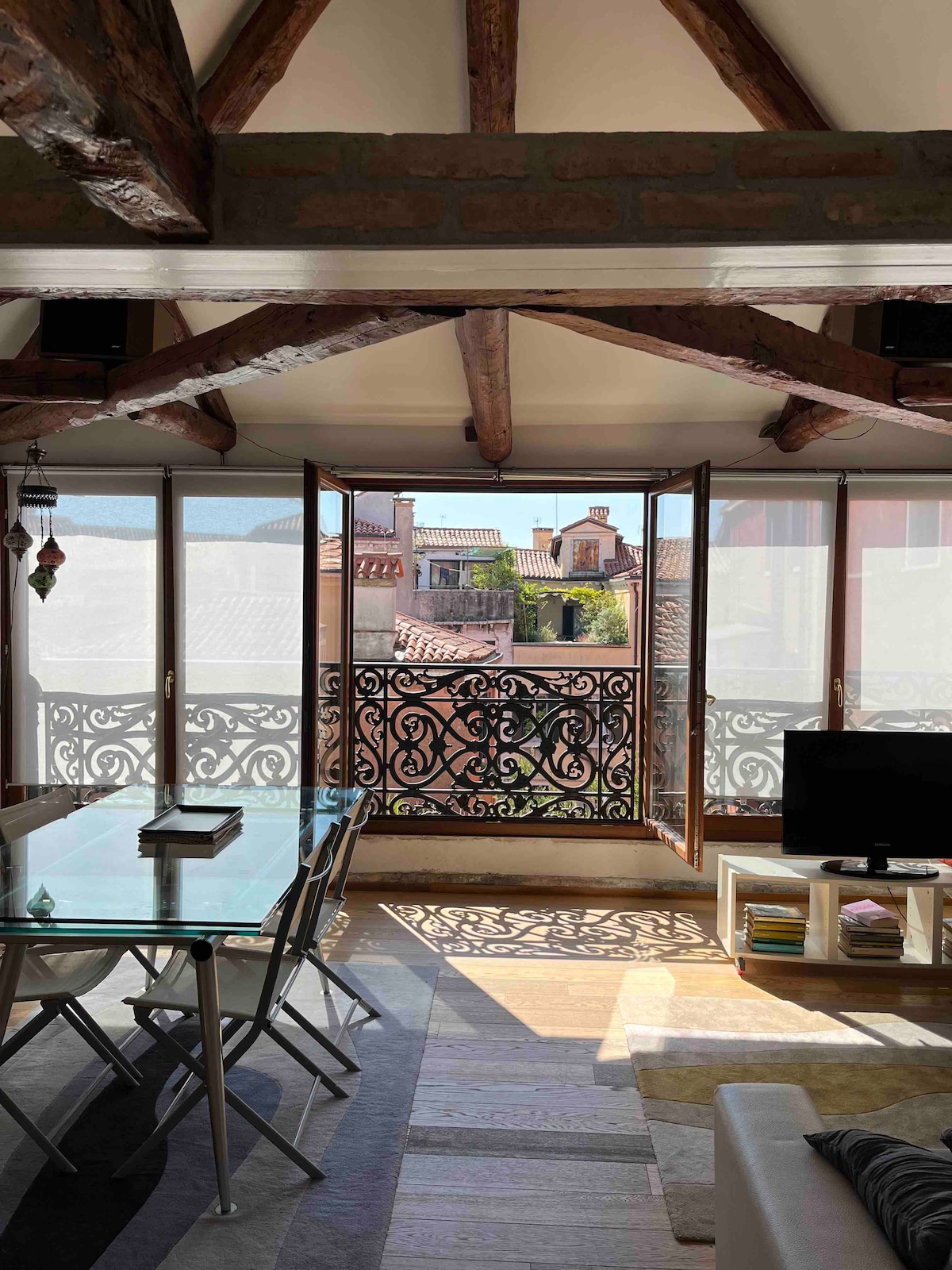 Bewonder de schoonheid van Venetië vanuit de gewelfde ramen van dit gastvrije en ruime appartement dat historische elementen combineert, zoals houten balken en eigentijds meubilair. Vanuit de grote ramen heb je een prachtig uitzicht op de gracht, doorkruist door gondels en de typische gotische gebouwen van Dorsoduro, de meest authentieke wijk van Venetië, gewaardeerd door kunstenaars en intellectuelen van alle leeftijden; uitgerust met twee badkamers en alle comfort vind je boeken en kunstobjecten.