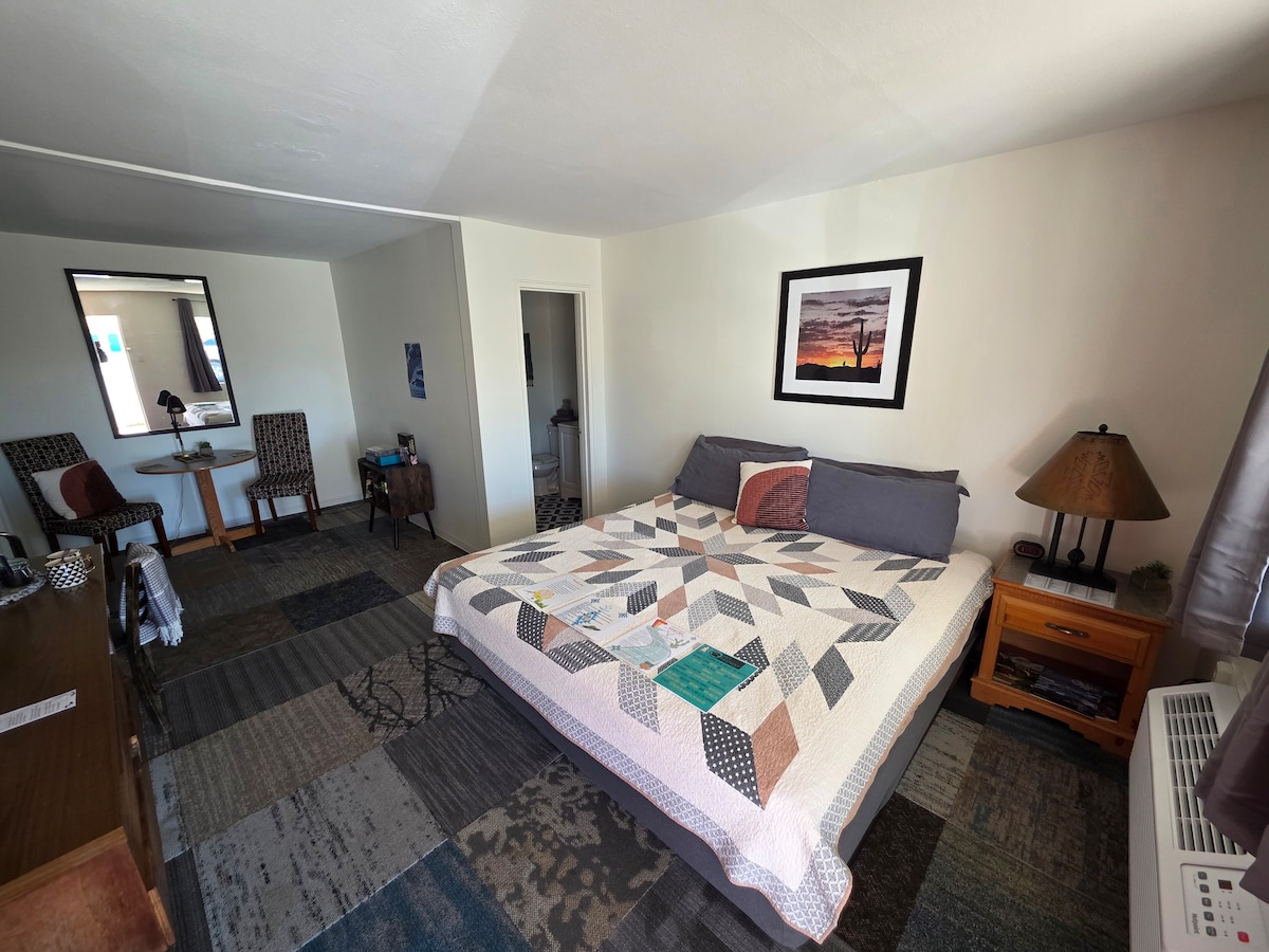 Onze Standard King is perfect geschikt voor maximaal twee gasten en biedt royale ruimte om comfortabel te ontspannen na een dagje Taos verkennen. De kamer is voorzien van een kluis, een keurig koffiezetapparaat en een minikoelkast. Het is de ideale opstelling voor reizigers die hun tijd willen maximaliseren om het schilderachtige New Mexico te verkennen. *TV IS MOMENTEEL NIET BESCHIKBAAR*