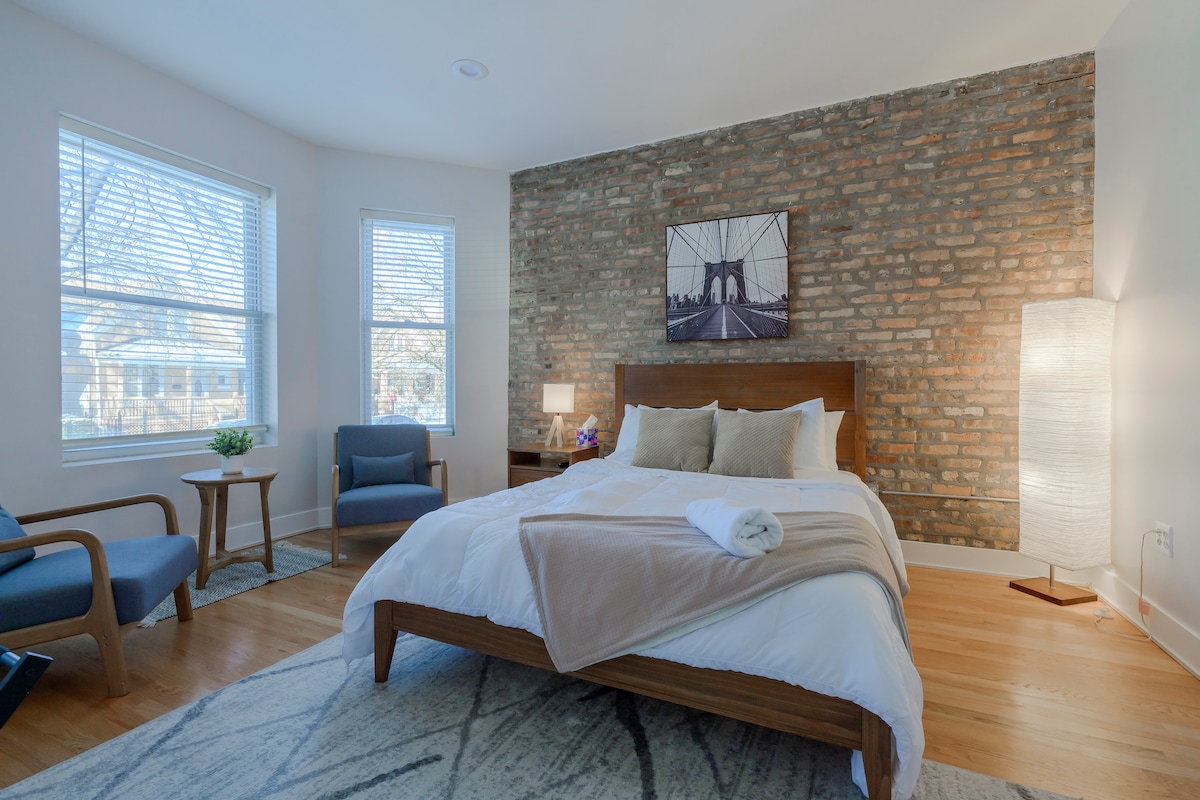 Luxe 1BR/2BA appartement op tuinniveau in het levendige Logan-plein! Comfortabel ingericht met veel licht en voorzieningen, gunstig gelegen op een blok van het Logan Square Blue Line Station en gelegen in een rustige straat. Op een steenworp afstand van alle hippe restaurants en uitgaansgelegenheden op Logan Square. Enorme achtertuin en patio met vuurplaats voor het gebruik door gasten. Gratis parkeergarage op het terrein en afstandsbediening. En als je het openbaar vervoer gebruikt, is het Logan Square 8 haltes, ~15-20 minuten van de Loop downtown!