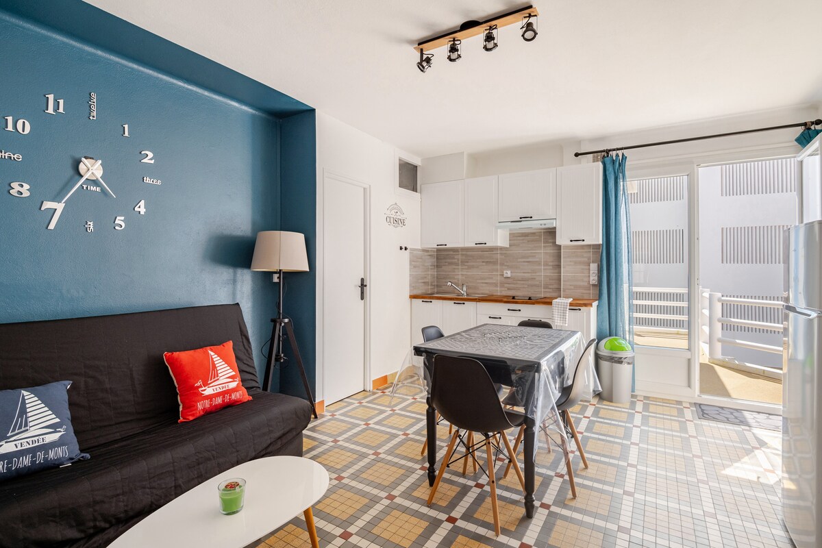 Tegenover de zee: geniet van een uitzonderlijk panorama. Schitterend appartement T2 (2/4 pers) gerenoveerd in 2024 - GEWELDIG COMFORT. Het strand en de duin liggen aan de voet van het appartement (geen weg om over te steken). Opmerkelijk uitzicht op de oceaan en het eiland Yeu vanuit de eethoek, de loggia en zelfs vanuit het bed in je kamer. Bewonder de zonsondergangen voor geliefden, gezinnen of met vrienden. Je hebt je eigen omheinde garage; ideaal voor je auto en voor het opslaan van fietsen, aanhangwagens en strandspellen.