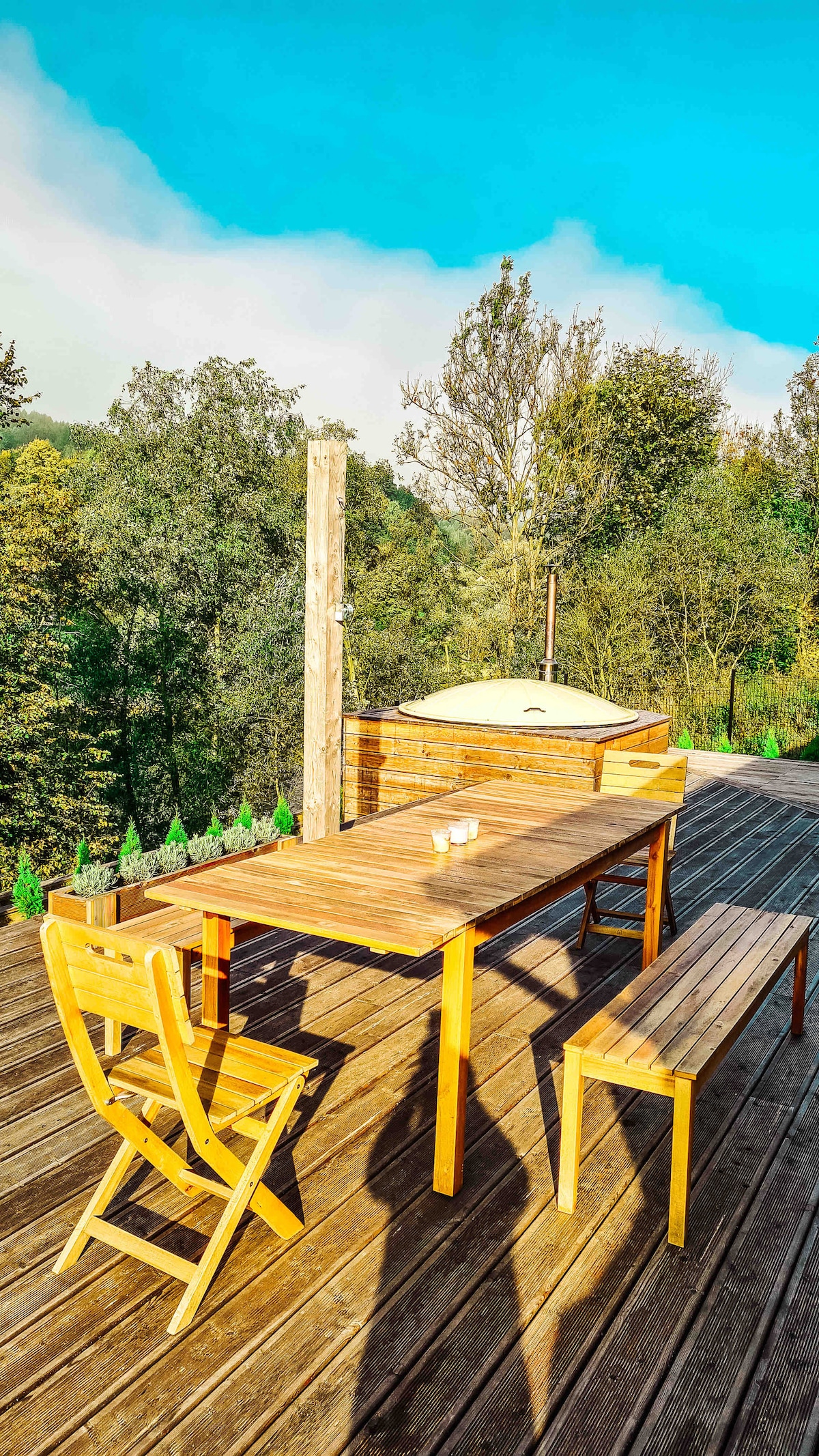 Comfortabel 103 m² houten huis met twee verdiepingen met een garage, volledig ingericht. Beschikt over een woonkamer met open haard, terras en eethoek, 2 slaapkamers boven (tweepersoonsbed + twee eenpersoonsbedden, beide met balkon), een extra slaapkamer met slaapbank, 2 badkamers en een toilet. Volledig uitgeruste keuken met koelkast, inductiekookplaat, wasmachine, betegelde kachel en eettafel. Ideaal voor gezinnen en groepen.