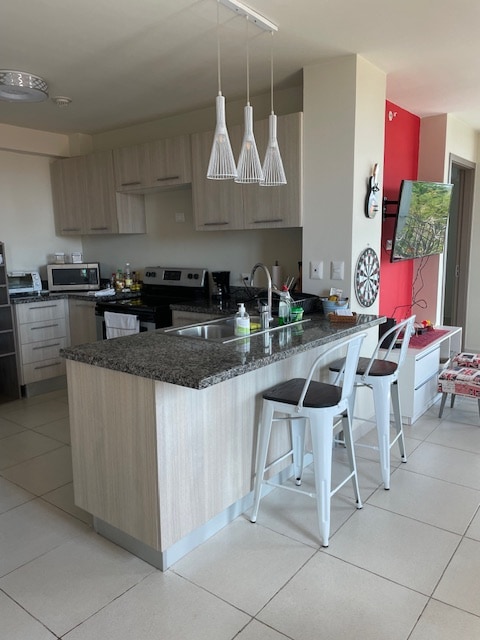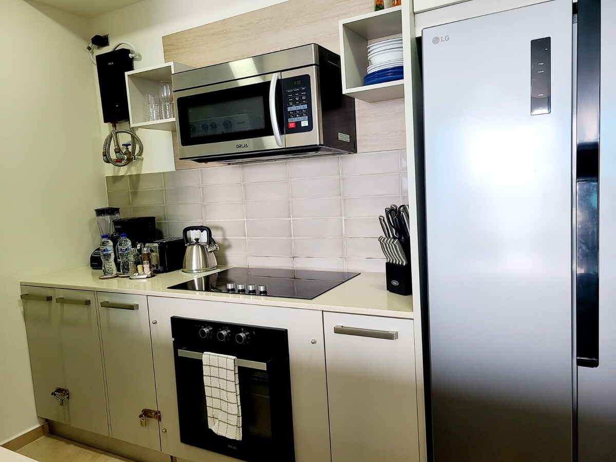 Deze totale unit aan het strand, op de bovenste verdieping, is prachtig ingericht en uniek vanuit elk appartement in het gebouw. Bekijk die marineblauwe keuken! Geniet van de spectaculaire zonsondergangen van Panama vanaf dit geweldige balkon. De keuken is volledig gevuld met hoogwaardige apparaten en klaar om je favoriete maaltijd te maken. Of loop een paar minuten het strand op naar een fonda voor de verse vangst van de dag!