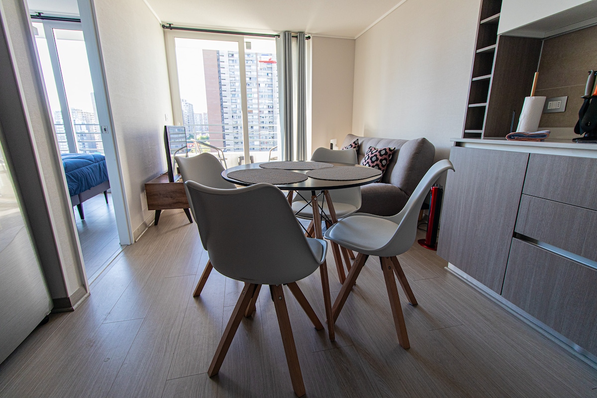 Geniet van een onvergetelijk verblijf in ons prachtige appartement! Volledig uitgerust, met wifi (perfect voor werken op afstand), volledig uitgeruste keuken, gezellige kamer en privéparkeerplaats in het pand. 📍 Locatie: op 8 minuten lopen van de metro Ñuble (lijn 5 en lijn 6). 🛏️ Capaciteit: maximaal 2 personen ✨ Voorzieningen: wifi, tv, Netflix, beddengoed, handdoeken, kookgerei en nog veel meer. Jouw thuis weg van huis wacht op je!