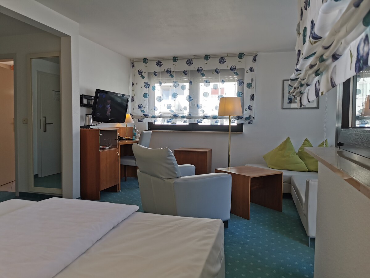 Voor gasten met de hoogste comfortklachten bieden we nu onze woonsuites aan met ongeveer 45 vierkante meter woonruimte verdeeld over twee kamers en voor het grootste deel met een balkon - ideaal voor korte en ook langere verblijven voor een- en tweepersoonsbezetting. Geniet van feestende luxe: de elegante woonsuites stralen een prachtig design en een gezellige woonsfeer uit. De kamers zijn van zeer hoge kwaliteit met de nieuwste technologie en van alle voorzieningen voorzien.