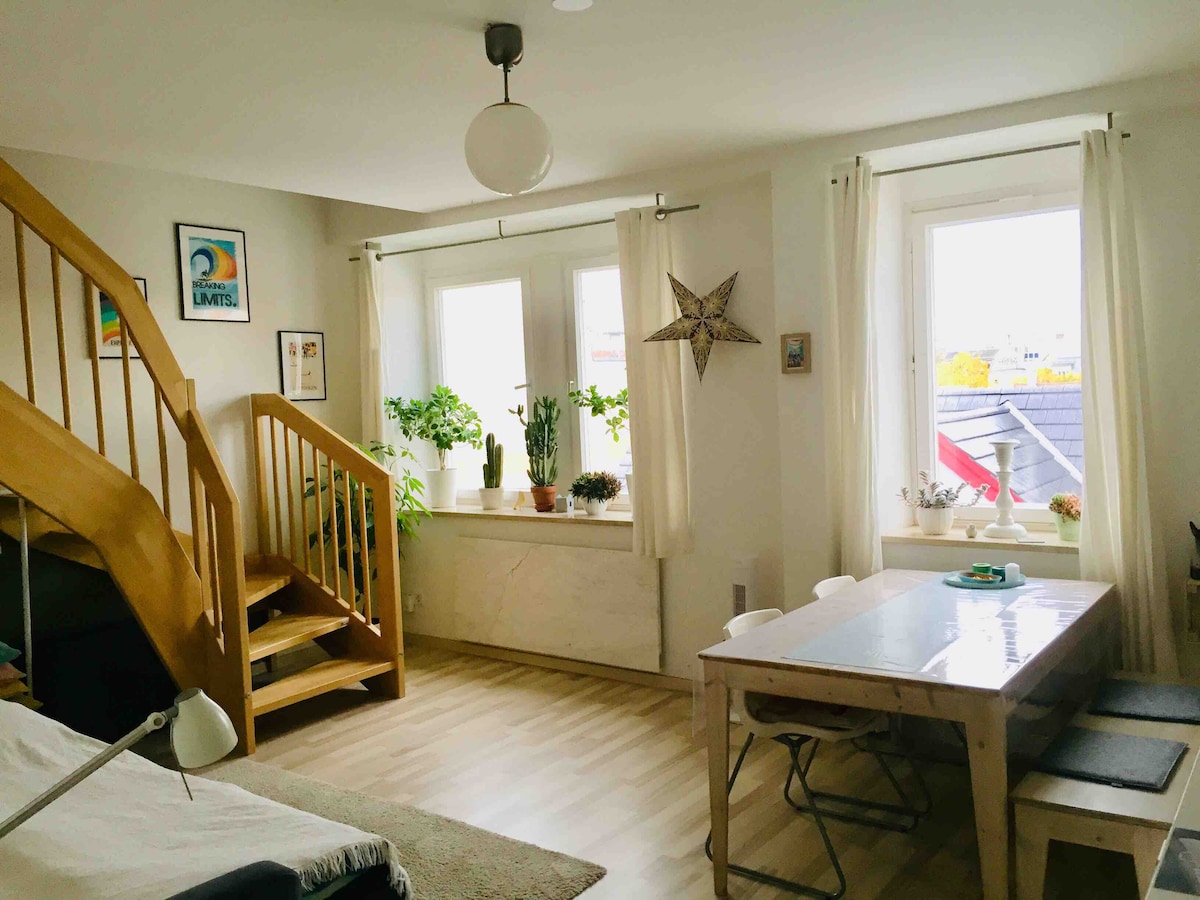 Ein ehemaliger Dachboden in einem charmanten Altbau wurde 2016 zu einem Studio mit Liebe zum Detail ausgebaut. Es findet sich darin kaum etwas, was es so zu kaufen gibt. Über einen kleinen Dachaustritt blickt man über die Dächer von Nürnberg. In dem gemütlichen und einzigartigen Raum fühlt man sich einfach zu Hause und kann die Ruhe genießen. Zentral und dennoch sehr ruhig gelegen, erreicht man mit der U-Bahn in 10 Minuten das Zentrum von Nürnberg.