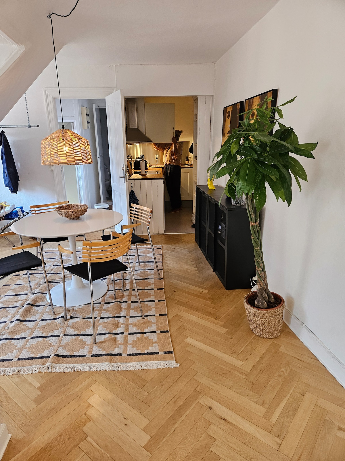 Mijn appartement bevindt zich op de derde verdieping van een 300 jaar oud erfgoedgebouw. Het is belangrijk op te merken dat er geen lift is, wat gebruikelijk is omdat minder dan 9 procent van de gebouwen in de binnenstad van Kopenhagen liften heeft. Houd dit in gedachten als je zware bagage hebt. Mijn onlangs gerenoveerde appartement beschikt over een gang die naar de badkamer leidt en een woonkamer die uitkomt op het slaapgedeelte en de keuken. Het biedt een gezellig (Hyggeligt) uitzicht op de daken van de stad.