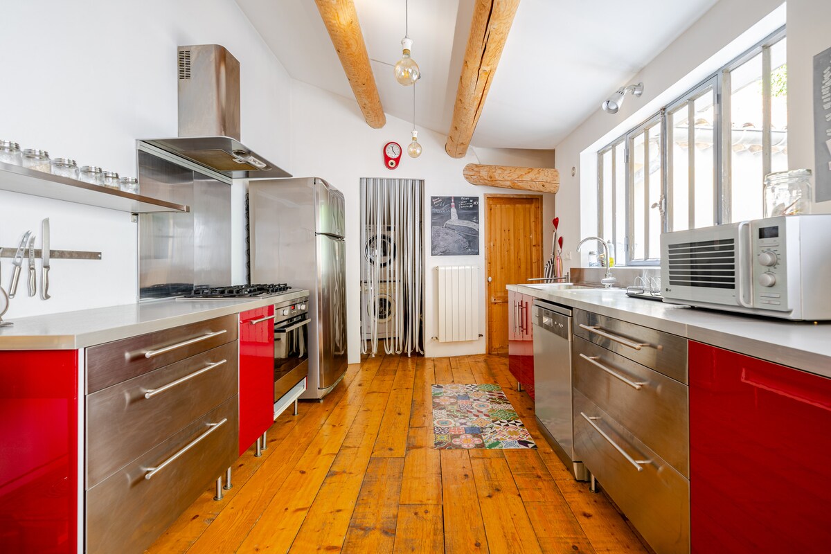 Charmant dorpshuis van 110 m2 in het hart van het centrum van Bedoin met een eigen binnenplaats (waar je je fiets kunt parkeren) Het huis was een voormalige schuur in ruïnes, volledig gerenoveerd met een verfijnde inrichting : een mooie keuken open naar de binnenplaats met grote ramen, 3 slaapkamers, 2 badkamers. Houd er rekening mee dat als je met kinderen komt de trap om je naar de slaapkamer te leiden vloer geen vangrail heeft geen vangrail.