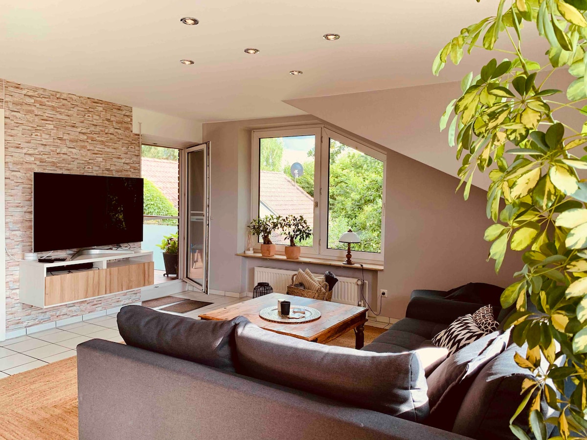 Welkom in onze lichte 90 m ² gevoel - goede oase met loggia. Zeer rustige en landelijke locatie, het appartement bevindt zich op de 1e verdieping van ons vrijstaande huis. Hier woon je op het platteland, aan de rand van het Ruhr-gebied en kun je nog steeds snel de bezienswaardigheden van de Ruhrpotts bereiken. Als u op zoek bent naar rust, dan bent u op het juiste adres. Als je het stadsleven wilt, moet je een andere accommodatie kiezen.