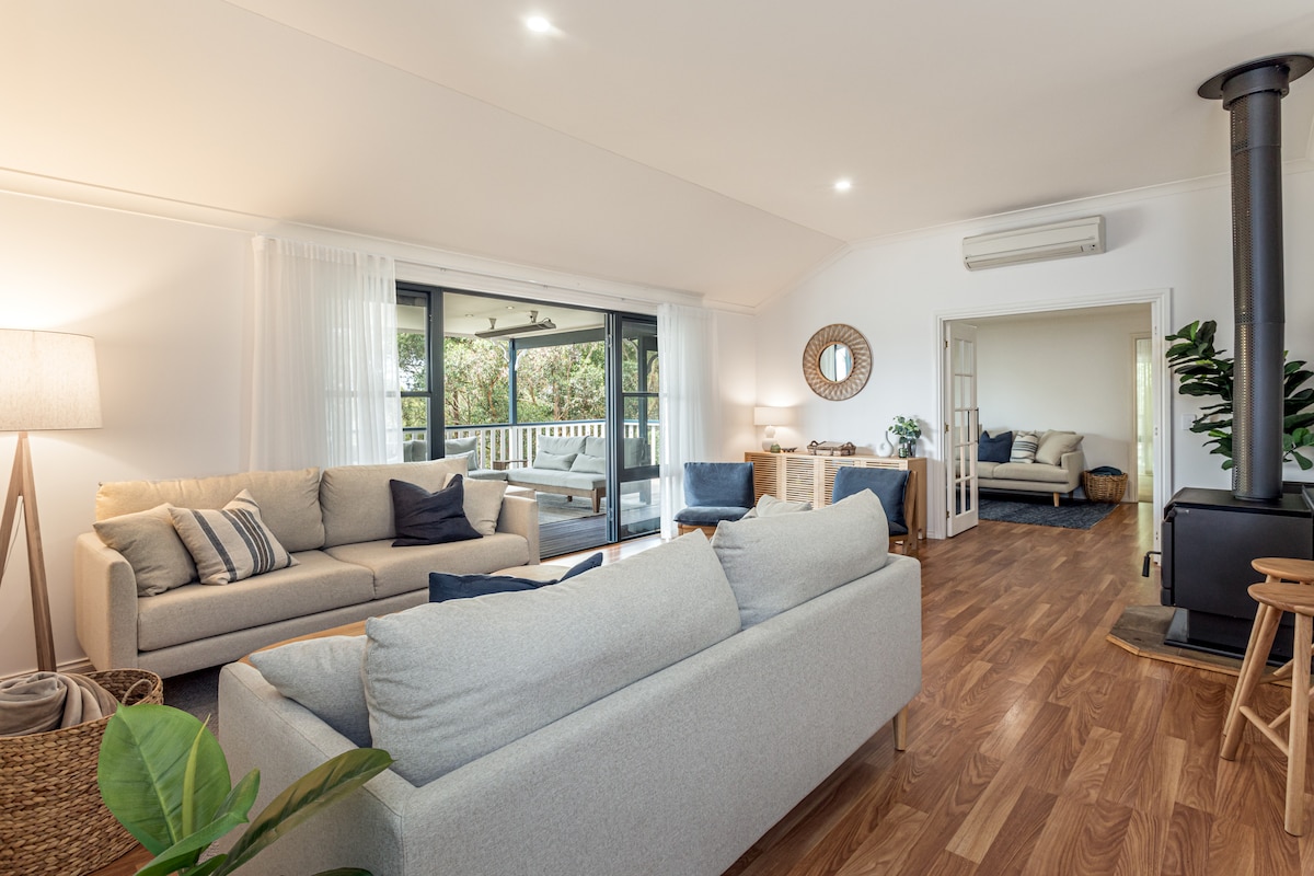 Enjoy the tranquillity of this uniquely designed octagonal chalet, set high on Weedon Hill in a natural Australian bush setting. Inlet glimpses, sounds of the ocean, sunrises, abundant birdlife and native bush vistas from every window are but a few of the wonders you will experience. With large windows throughout your experience of the outdoors is intensified in this cosy wooden cottage with woodfire for extra warmth & coziness. Only 3km from town centre, however feels like you are miles away.