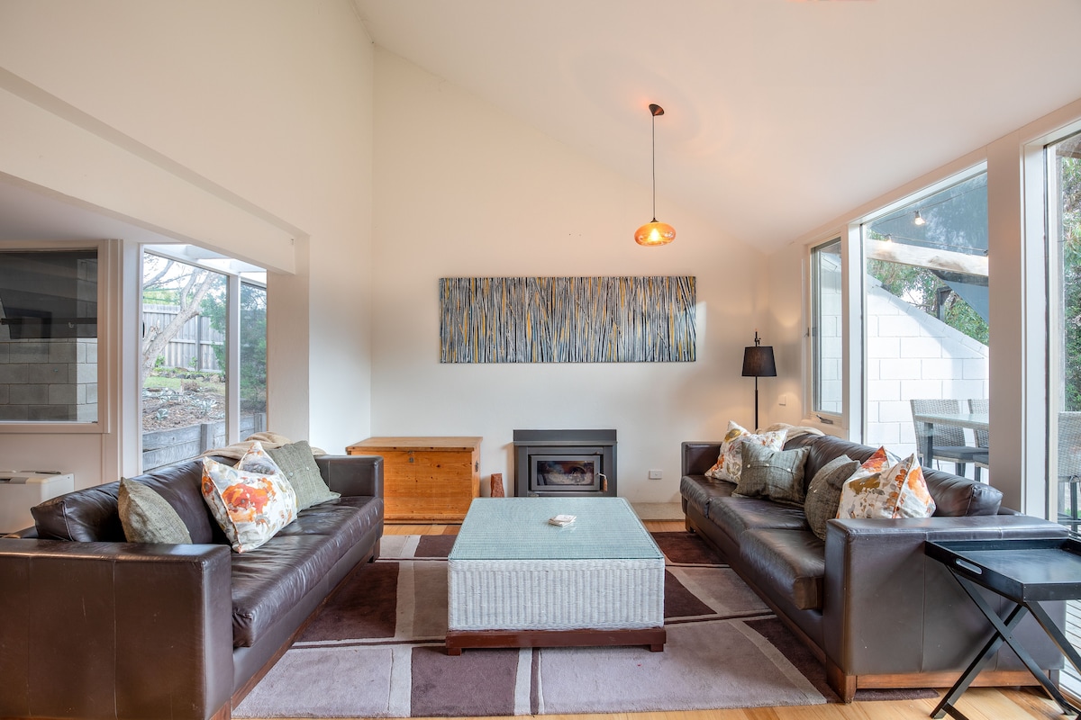 Een rustige studio, met gezellig houtvuur op een drukke hectare, in een rustige straat, dicht bij het strand van Ocean Grove, het dorp en het natuurreservaat. Een uitstapje met een lage eco-impact: alle elektrische, op zonne-energie, ethisch brandhout, enz. Ruim en goed ontworpen, met een gastvrije sfeer, met: een complete keuken, ontbijt, eigen tuin, split airco, smart-tv, wifi en fietsen.