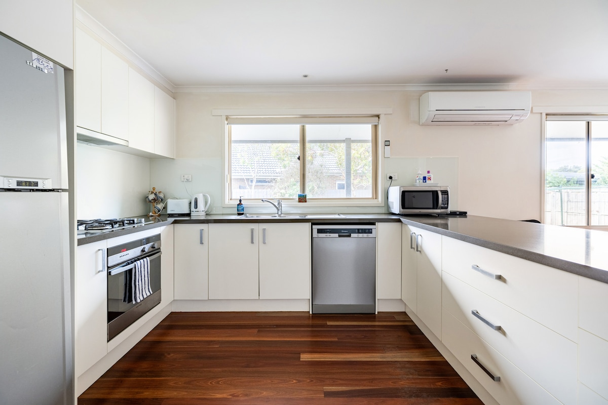 Kustretraite voor stellen en gezinnen; loop naar stranden en inham voor zomerstrand- en wateractiviteiten. Groot tv- en gasvuur voor winteruitjes! Ocean Grove is een fantastische stad aan de Bellarine met geweldige stranden om te surfen en te zwemmen en een inhamruimte die geweldig is voor kinderen. We hebben trendy cafés, een nabijgelegen supermarkt (laat geopend), winkels, restaurants en sportfaciliteiten (golfbaan, binnenzwemmen, bowlen, enz.)