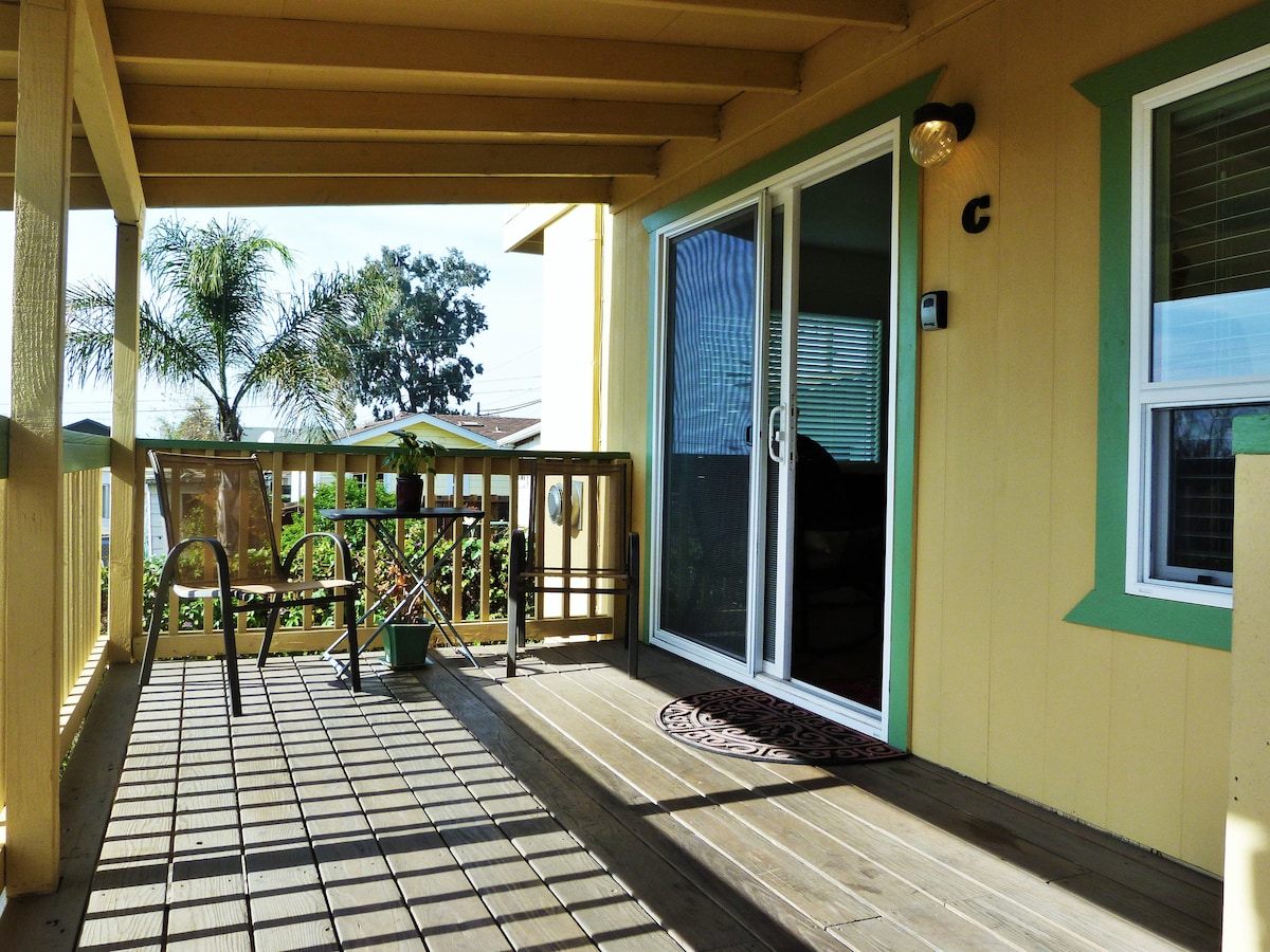 1/2 blok van het strand, bovenbungalow, schoon, gemeubileerd en open indeling, geweldige kamer, terras, eet- en woonkamer, 1 slaapkamer met queensize bed/ verduisterende gordijnen, 50" flatscreen met goede wifi, Roku, groot terras voor zonnebaden, vogels kijken. Lokale grens tussen natuur en stad. We hebben wasberen gezien, een coyote, zwaluwnesten in de lente en soms maken spinnen webben buiten. We zijn precies waar stedelijk en wildland elkaar ontmoeten. Langere verblijven beschikbaar, vraag het gewoon. De kalender is vaak geblokkeerd, maar we kunnen datums vrijgeven.