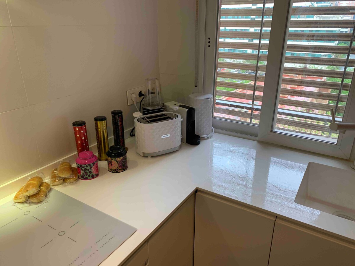 Duplex appartement, 16e hoogte met fantastisch panoramisch uitzicht en hoge kenmerken superieur aan een hotel. Volledig geluiddicht, ideaal om zonder lawaai te rusten. Perfect voor een stel als unieke en exclusieve ruimte Naast het winkelcentrum ARENA, met winkels en restaurants. Gratis eigen parkeerplaats verbonden met de liftloft. Metro y supermercados a 2 min walkando.Playa a 5 min met de auto. Exclusief gebruik van koppels : geen kinderen of bezoek toegestaan. WiFi + TV65'' en volledige keuken met alles erop en eraan.