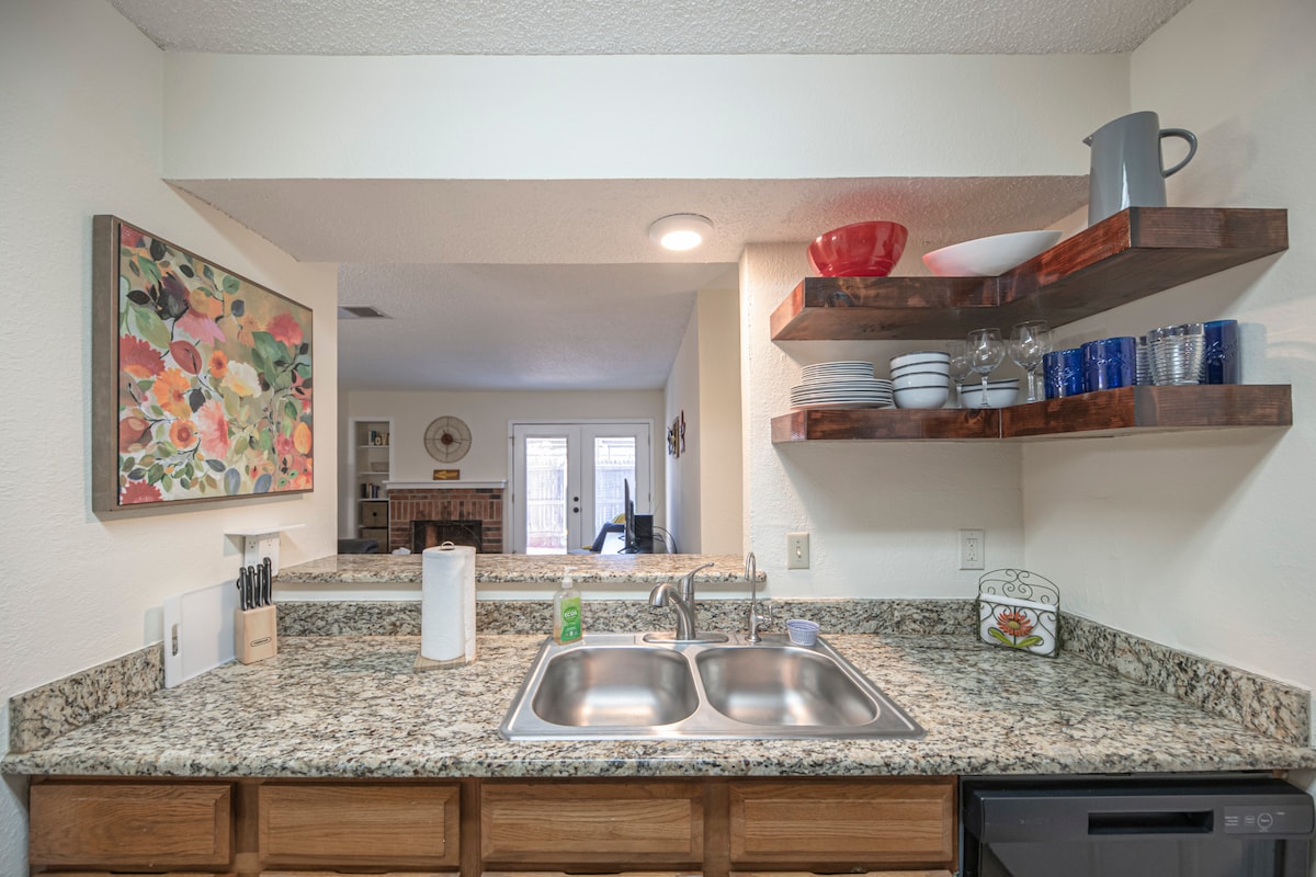 Volledig ingericht. Recente keuken: graniet, vaatwasser, magnetron, oven, koelkast, potten/pannen, Keurig/koffiepads, borden, glazen, papieren borden, plastic bekers, bestek, wasmachine/droogmachine wasmiddel pods, droogvellen. Papieren handdoeken, douche/bad, toiletartikelen, handdoeken, toiletpapier, wifi, vloerventilatoren. Queensize kussenmatras, dressoir, stoel, inloopkasten, hangers. Tweede slaapkamer, full-size kussenmatras. Houd er rekening mee dat de accommodatie LAGE PLAFONDS heeft en zich in het zuidelijke deel van Midland bevindt.
