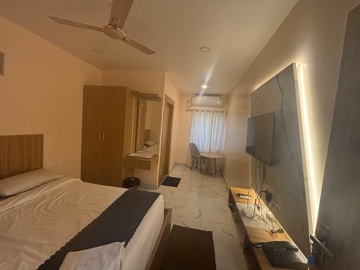 Gezinsvriendelijk 1 BHK-type met hal (woonkamer en kitchenette met slaapbank – slaapbank) plus een slaapkamer met een queensize bed en een aangrenzend bad. Geschikt voor 4 volwassenen. Privacy, veiligheid en rust in het hart van Jagannath Puri op slechts 300 meter loopafstand van de Jagannath-tempel. Voorzien van toilet, geiser en 1,5 ton airco met gas, kookgerei en noodzakelijke slaapsystemen voor een comfortabel verblijf voor 4 volwassenen / een gezin.