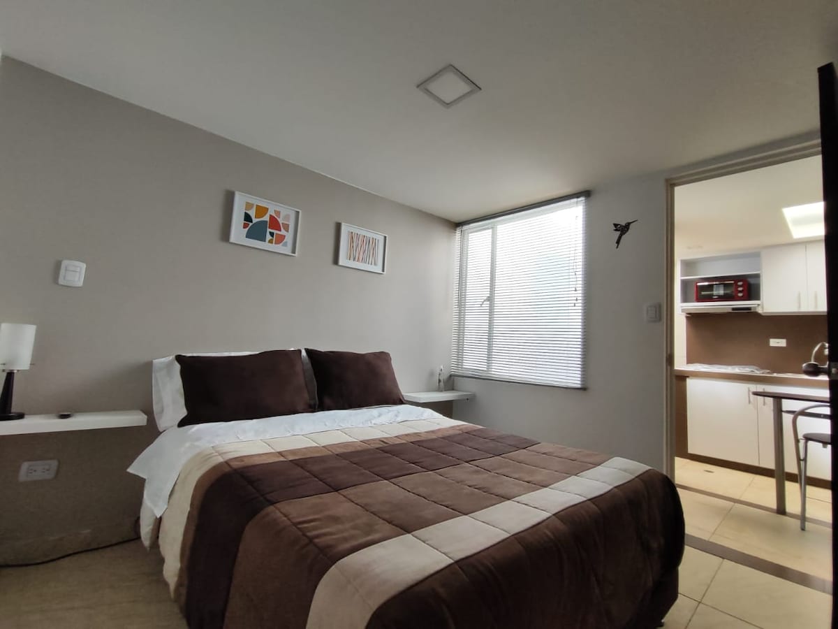Disfruta de este aparta estudio tranquilo, cómodo y bien equipado, ideal para que tengas una buena estadía. Ubicado a pocas cuadras del centro de la ciudad, en un lugar bastante tranquilo y de fácil acceso desde los centros comerciales y universidades. Cerca de rutas de transporte público y de comercio básico (droguería, panadería, supermercado, restaurante, salón de belleza, etc) Frente al edificio tenemos una amplia zona verde, segura y tranquila. Bienvenidos!!