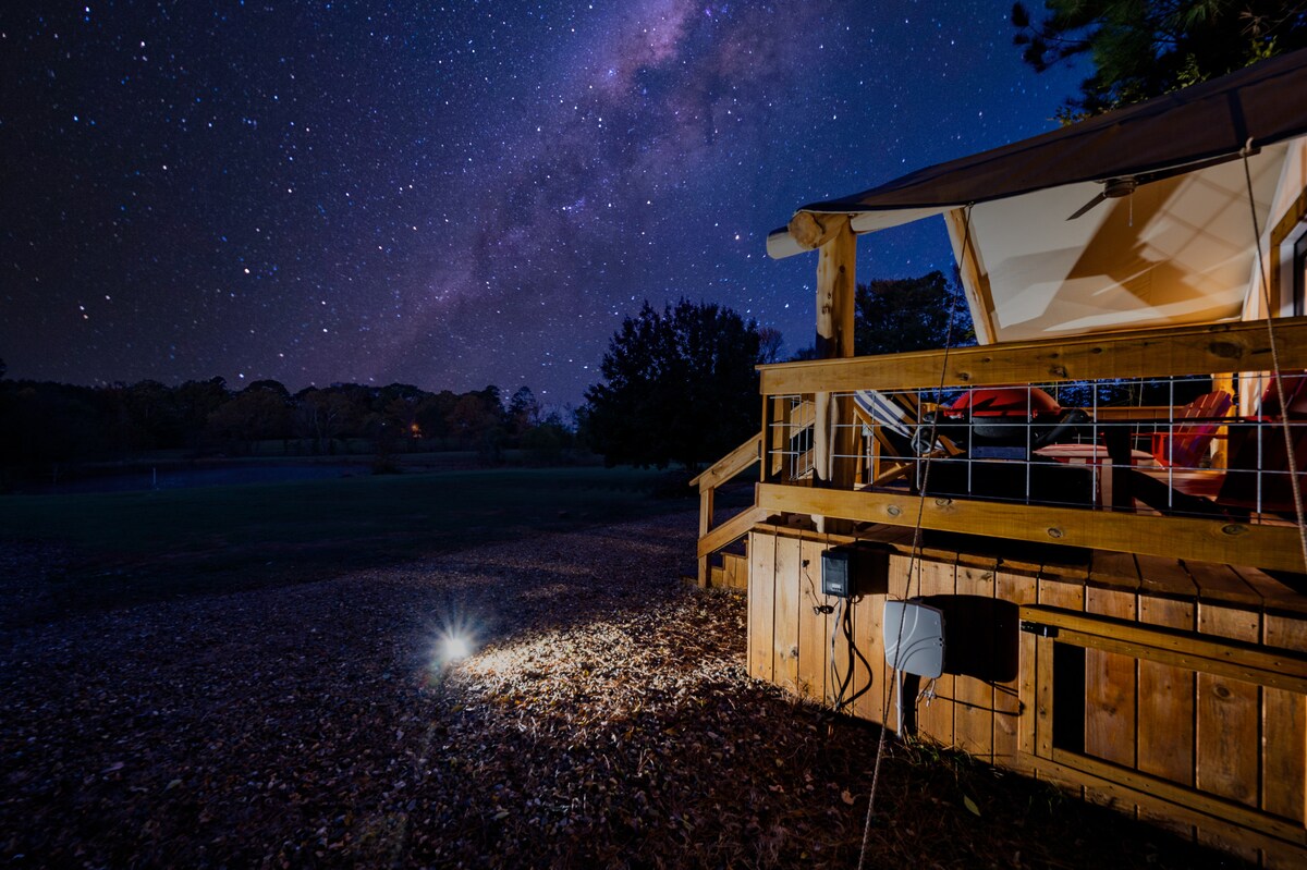 ** Huisdieren Verblijven gratis - Max 2** Onze unieke luxe tent in Broken Bow, OK is net opgewaardeerd! Volledig bad met bad met klauwvoet, warm water, twee HVAC-units, een nieuw tinnen dak en kitchenette met magnetron, broodroosteroven, kookplaten en minikoelkast. Inclusief wifi! Minuten van Beavers Bend Park waar je kunt zwemmen, wandelen en paardrijden. Na een hele dag plezier kun je ontspannen op de veranda met een glas wijn en de zon zien ondergaan. Kook uit, stargaze en laat je in slaap brengen door de natuur.