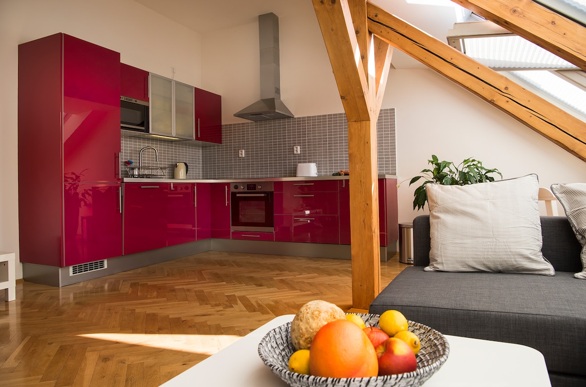 Zeldzame parel in Praag - favoriet op Airbnb. Beperkte beschikbaarheid; meestal volgeboekt. * Betoverende schuilplaats in Praag * Gerenoveerde loft met beloopbare centrale locatie * Ideaal voor koppels, soloreizigers of werk * Snelle wifi en smart-tv met Netflix * Volledig uitgeruste keuken * Beddengoed, handdoeken en toiletartikelen aanwezig * Spiraalvormige trappen leiden naar een dromerige slaapkamer met kingsize bed. * Badkamer met inloopdouche. * Airconditioning en ventilatoren * Metrolijn A (groene lijn) Namesti Miru - 2 minuten lopen
