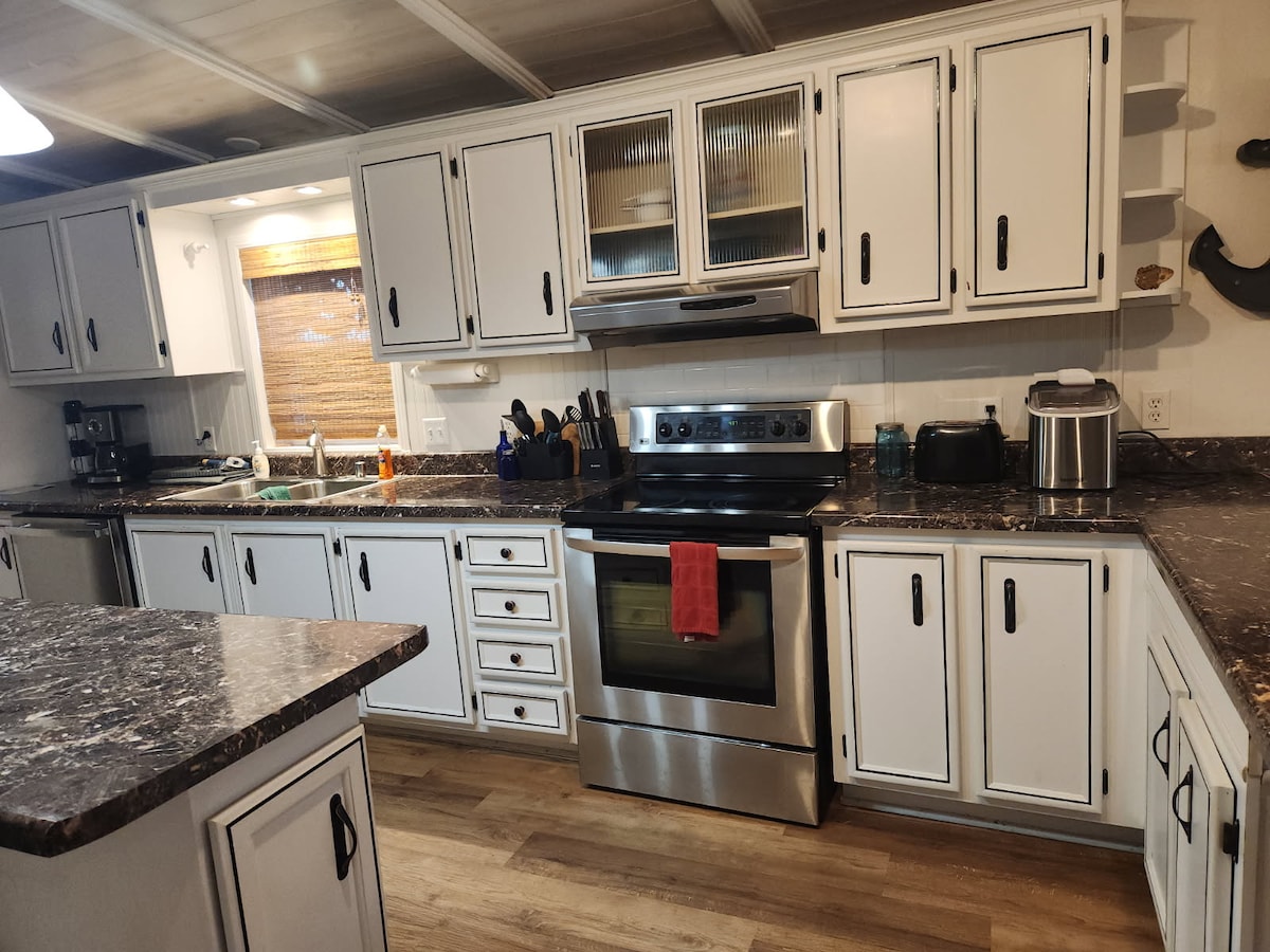 Geen huisdierenbeleid. Kingsize bed op de begane grond "Capt. Qtrs" met diep bad en suite!❤️Brede trap (geen spiraal!) Boven Q. Bdrm.(#2) comfortabel bed.+Bdrm.(#3) met twee eenpersoonsbedden Jeugd/Kinderen. Schone, stijlvolle en gezellige inrichting. Hal 2e BADDOUCHE.(Centrale verwarming,airco) Wasserij. Wifi satell. 1 SmartTV(Hulu,Amaz),dvd's, spelletjes. 3 banken. Goed uitgerust. Keuken. Propaan BBq. Bank Dek Privézitje. Buiten hout FirePit. .5 mijl. Baxter Boat Public Launch& Dogwood Cyn. Geen hut naast de deur, dus alle Bdms = uitzicht op de boom!😍