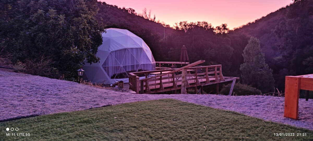 Domo muy cómodo para venir a desconectarse y relajarse (No se permite el uso de parlantes). Domo con aire acondicionado, salamandra, frigobar, baño completo c/agua caliente, Relájate en las noches estrelladas en un HOT TUB ( agua a 37°-39°) o refréscate en nuestra piscina, en glamping_domo_chile podrás caminar por los hermosos senderos de la zona. Recepción tabla de picoteo, desayunos en las mañanas . Todo incluido en el precio. Servicio de almuerzo a la carta.