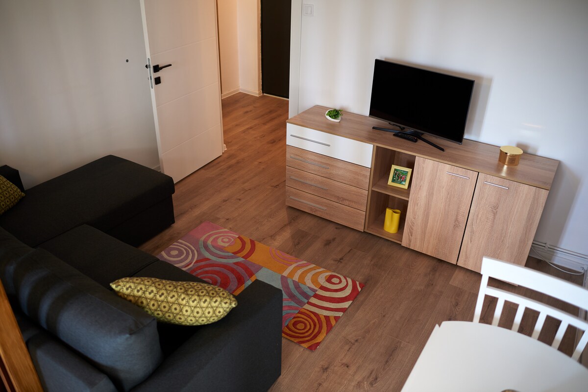 Volledig nieuwe ingerichte plek met nieuwe meubels en apparatuur, gelegen nabij het stadscentrum (rechte loopafstand ongeveer 500 meter), met supermarkten in de buurt . De studio op de 1e verdieping (geen lift) heeft een slaapgedeelte met een uitschuifbare bank voor 2 personen. De studio heeft een volledig uitgeruste keuken, koelkast, koffie espressomachine , magnetron, gas kookplaat, wasmachine, airconditioning, gratis kabel, smart-tv , gratis wifi. Gratis privé- en openbare parkeergelegenheid in de buurt van het gebouw.