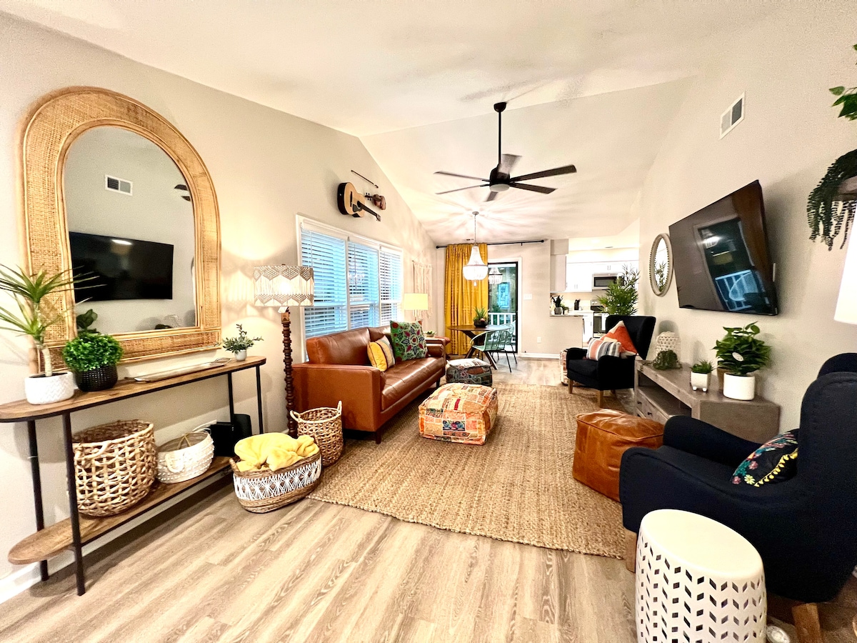 The Boho Bungalow is a newly renovated duplex with a one-car garage, located in a quiet cul-de-sac with a scenic wooded back yard that gives off the vibes of being in the NC mountains. Five minutes from local restaurants, grocery stores and shopping, the Boho is also in close proximity to Camp Lejeune and is only 30-35 minutes from Topsail Beach and Emerald Isle. Included with the Boho is high speed Wi-Fi, 65" ROKU TV, washer/dryer, stove, microwave and all of the kitchen essentials + more!
