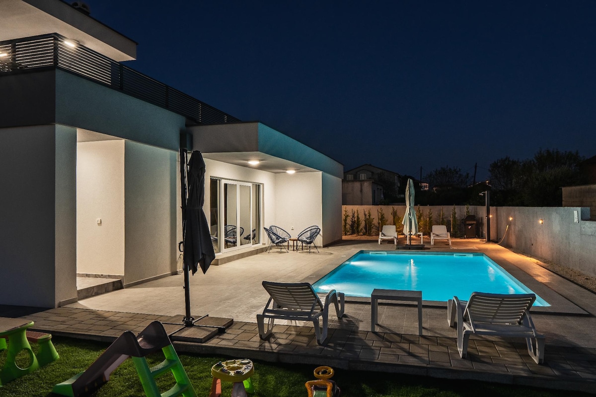 Ontspan met je gezin in deze gezellige accommodatie, in een rustige omgeving met een verwarmd zwembad, Kamado-grill, groot terras met zwembad, terras bij de ingang van het huis, grote tuin en 2 parkeerplaatsen in de tuin. Afstand Nin3,5 km, Zadar 17 km, luchthaven Zadar 27 km, Paklenica National Park 45 km, Krka National Park 60 km, Kornati 80 km Nationaal Park, Plitvice Meren 120 km. Je kunt de omgeving verkennen door te wandelen of te fietsen door de natuur. Vlakbij het huis is er een openbare mini-voetbal speeltuin met kunstgras.