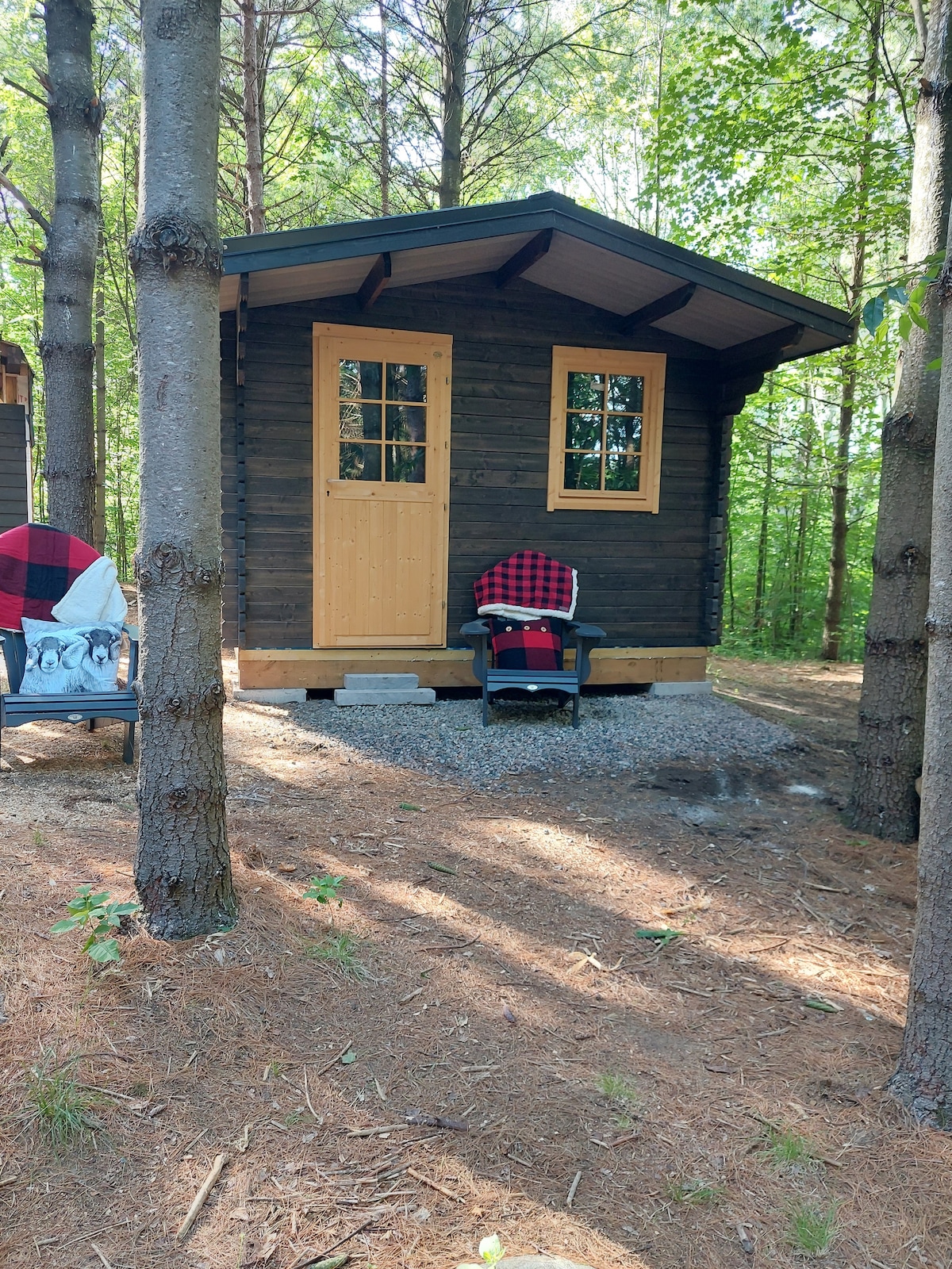 Our two bedroom cabin + cubby (available in summers) by a scenic pond is a private getaway while close to the main road and many amenities. Private outdoor space includes hot tub, deck, fire pit, and walking trails. We have a barn with ping pong and foosball tables. We are 20 min to Barrie, 10 min to Midland, 20 min to Balm beach, Wasaga beach, Mt. St Louis and Horseshoe Valley resort.