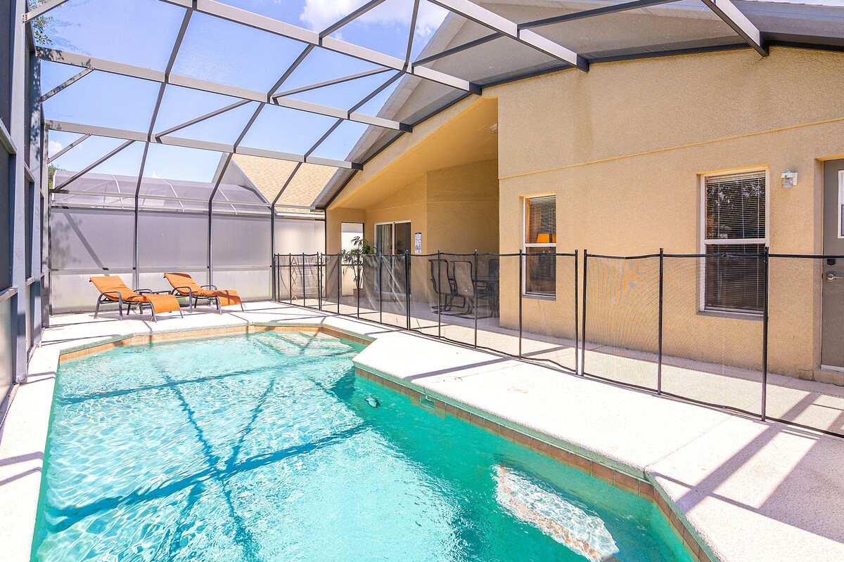 This sunny single-story home has 4 beautiful bedrooms, 2 full bathrooms, new AC system, fully stocked kitchen, and private screened freshwater pool. Perfect for families or groups, it accommodates up to 8 guests. Just minutes from DisneyWorld, Universal Studios, SeaWorld, Legoland, and Orlando’s top attractions. Conveniently located close to restaurants and shopping, this non-smoking house is nestled in a peaceful and secure resort, offering all the comforts of a "home away from home" vacation.