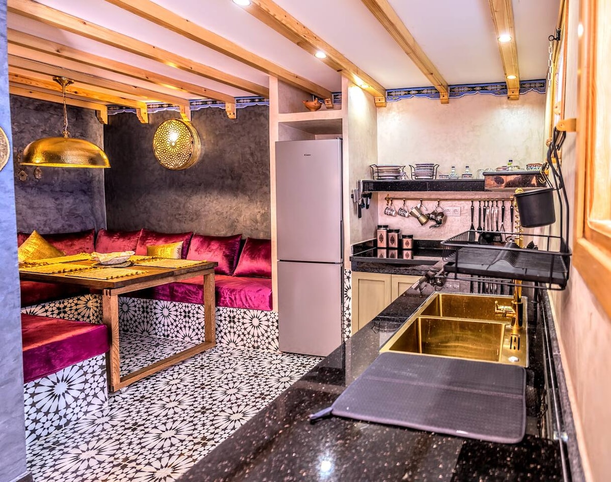 Modern appartement in de oude stad van Chefchaouen met een prachtig uitzicht op de bergen en de natuur. Beschikt over twee slaapkamers: een gezellige kamer voor koppels en een andere met drie bedden. De badkamer is schoon en stijlvol met een regendouche. De volledig uitgeruste keuken is voorzien van een wasmachine, koffiezetapparaat en koelkast. Dicht bij het centrum en beroemde oude stadsmarkten, met parkeergelegenheid in de buurt. Geniet van een prachtige zithoek en snelle 5G glasvezel-wifi.