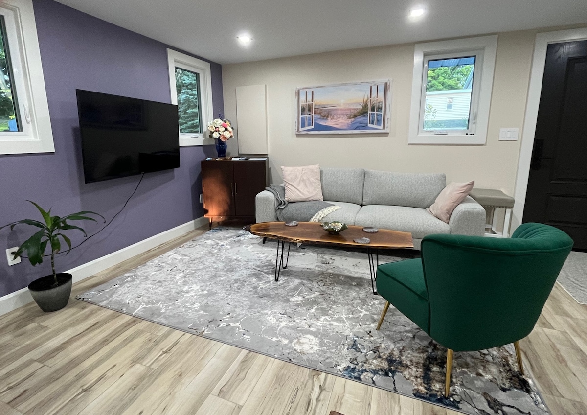 Uitnodigende gastsuite met twee verdiepingen; licht en schoon. Twee queensize bedden en twee eenpersoonsbedden. Grote tuin om te genieten van de sterren rond een kampvuur. Ga naar Sandbanks Park. Zwemmen, het hele jaar door wandelpaden en zandduinen ontdekken. Parkpas inbegrepen. Bezoek lokale wijnmakerijen, restaurants en ambachtelijke brouwerijen, samen met schilderachtige boetieks. Van oktober tot mei, plan om te genieten in het bubbelbad of te genieten van een drankje op het terras rond een propaangas open haard. Dekens, badjassen, slippers aanwezig. Gesloten van juni tot september. Parkeren voor twee auto 's.