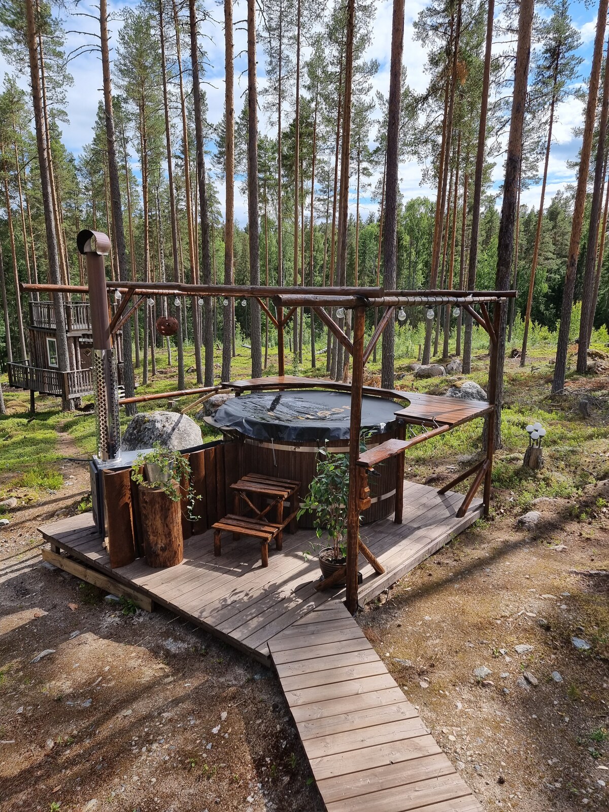 Ervaar de perfecte mix van modern comfort en wilde schoonheid in onze afgelegen hut die 10 km diep in het bos ligt. Deze afgelegen accommodatie ligt midden in het bos en is de ideale plek voor iedereen die even helemaal tot rust wil komen. Ontspan op het ruime terras, geniet van het bubbelbad met een panoramisch uitzicht op de natuur of ontspan in de sauna. Verken nabijgelegen wandelpaden en met een beetje geluk zie je misschien elanden, lynxen, beren of een verscheidenheid aan kleinere bosdieren en vogels.