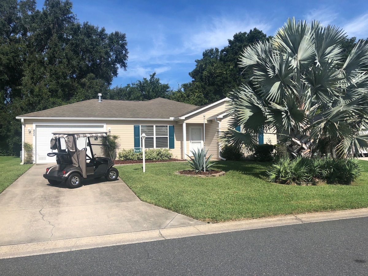 Deze woning begroet je met een oprit Pelikaans schilderij, geweldige landschapsarchitectuur en een decoratieve glazen toegangsdeur. Savanna luiken en comfortabele meubels in het hele huis. 12 minuten rijden met een golfkarretje naar Lake Sumter en 17 minuten naar Brownwood Square. Gebruik de meegeleverde golfkar op benzine om er te komen! Sea Breeze Rec Center met zwembad, pickleball, enz. ligt op slechts een paar minuten afstand. Supermarkten in de buurt. Rustige buurt. Honden onder de 25 lbs toegestaan.