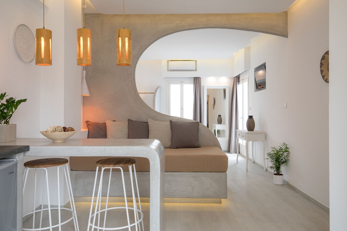 The deluxe sea view studio is a dream come true. Freshly remodeled, with all modern amenities, these rooms are some of the most beautiful in Kamari. Fully equipped kitchenettes, flat screen televisions, ecological air conditioning, renovated bathroom