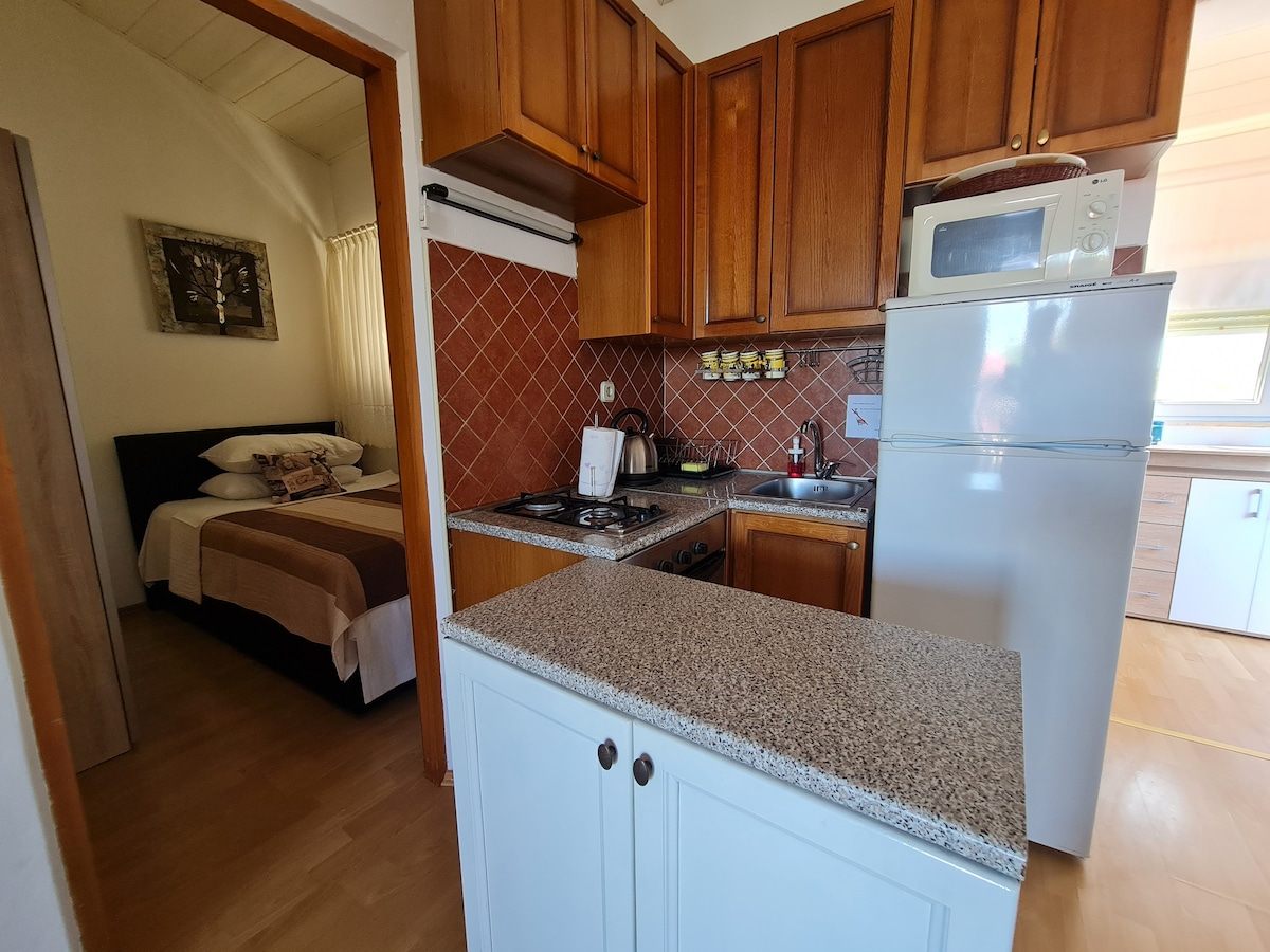 Een cca 30m2 uniek pension/taverne naast onze appartementsvilla. Vrijstaand van de villa zelf, met een binnenhaard, airconditioning, keuken, een bank die uitklapt tot een bed voor 2 personen (+ 1 extra bed indien nodig), een eettafel en een kleine badkamer. Er is ook een tafel/stoelen voor het pension, die dienen als een klein terras in de tuin!