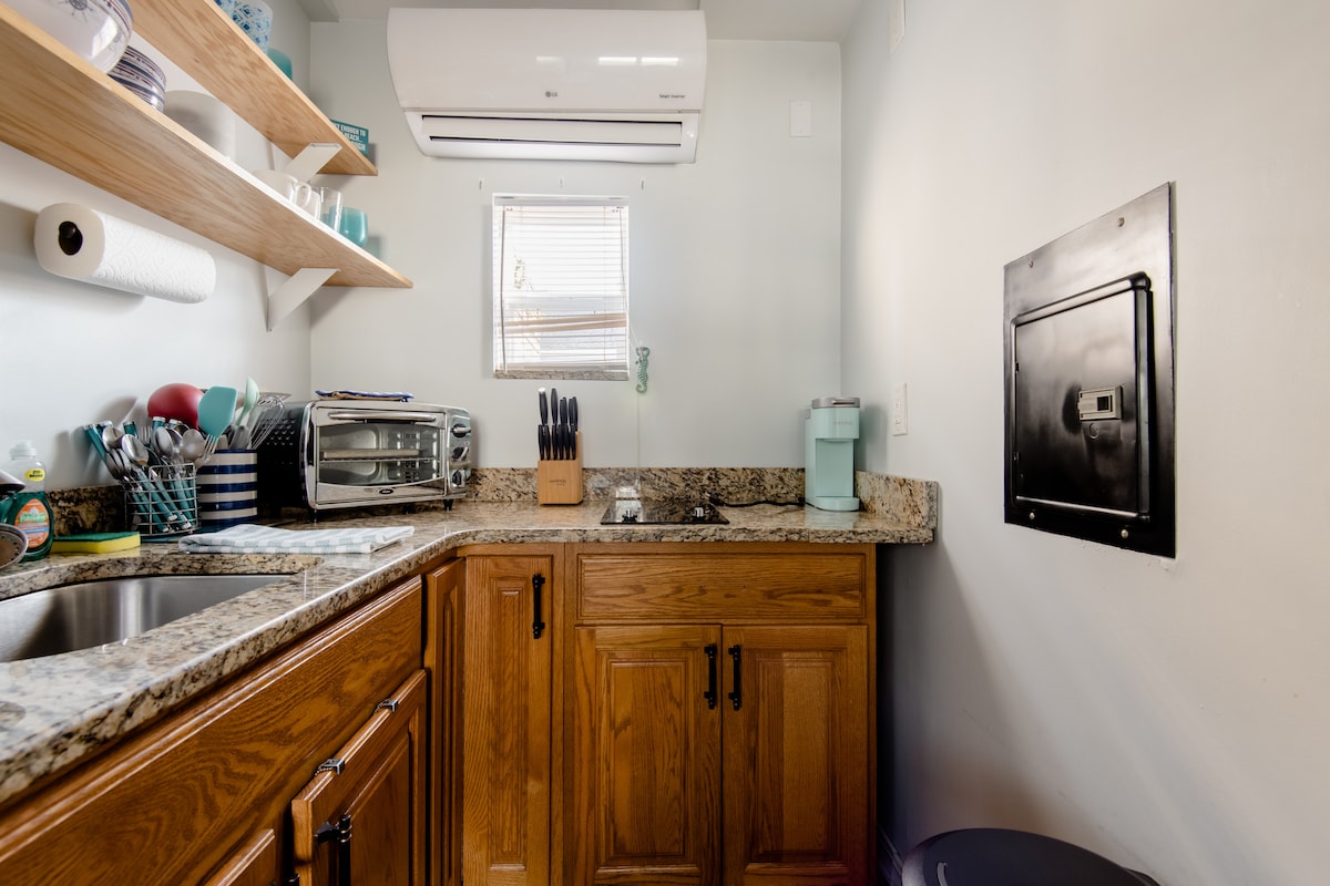 3 nachten min. verblijf 6/1 tot Labor Day. Cottage #3 is een slaapkamer (kingsize bed) onlangs gerenoveerd, goed ingericht met comfortabel meubilair en bijgewerkte afwerkingen. Het is uitgerust met een moderne inrichting. Het huisje heeft een volledig gevulde keuken met potten en pannen en keukengerei voor die momenten waarop je misschien gewoon binnen wilt blijven en wilt koken. Wasdroger van volledige grootte. Een eigen omheinde patio met een gasgrill, tafel en stoelen. Slechts vijf minuten naar het zandstrand. Ja, we staan huisdieren toe.