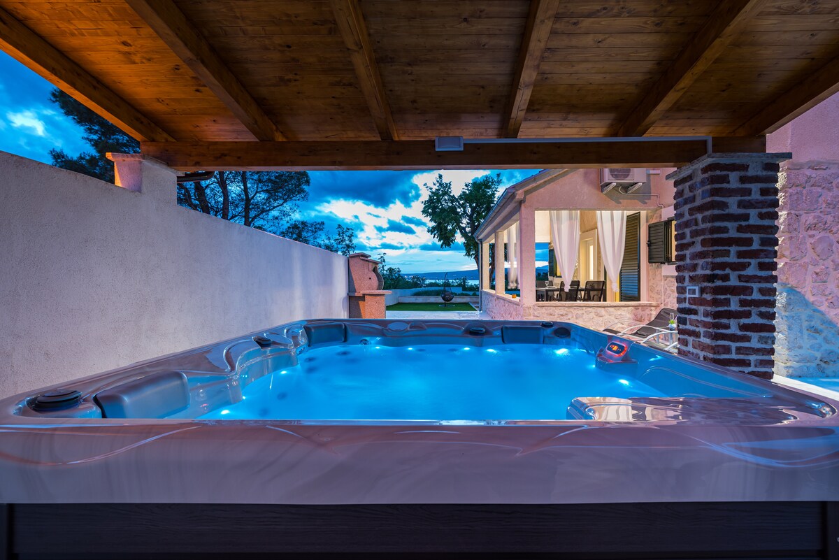 This beautiful villa with heated pool, hot tub and sauna is set on a remote and secluded landscape with a breath-taking view over the valley Heated pool from April to November Great place for relaxing and a starting point for exploring the region and Croatia! City distance Zadar is 28 km (airport 20 km) away Šibenik is 50 km away Split is 125 km (airport 99 km) away Attraction distance Plitvice lakes 125 km away Krka 45 km away Kornati 30 km away