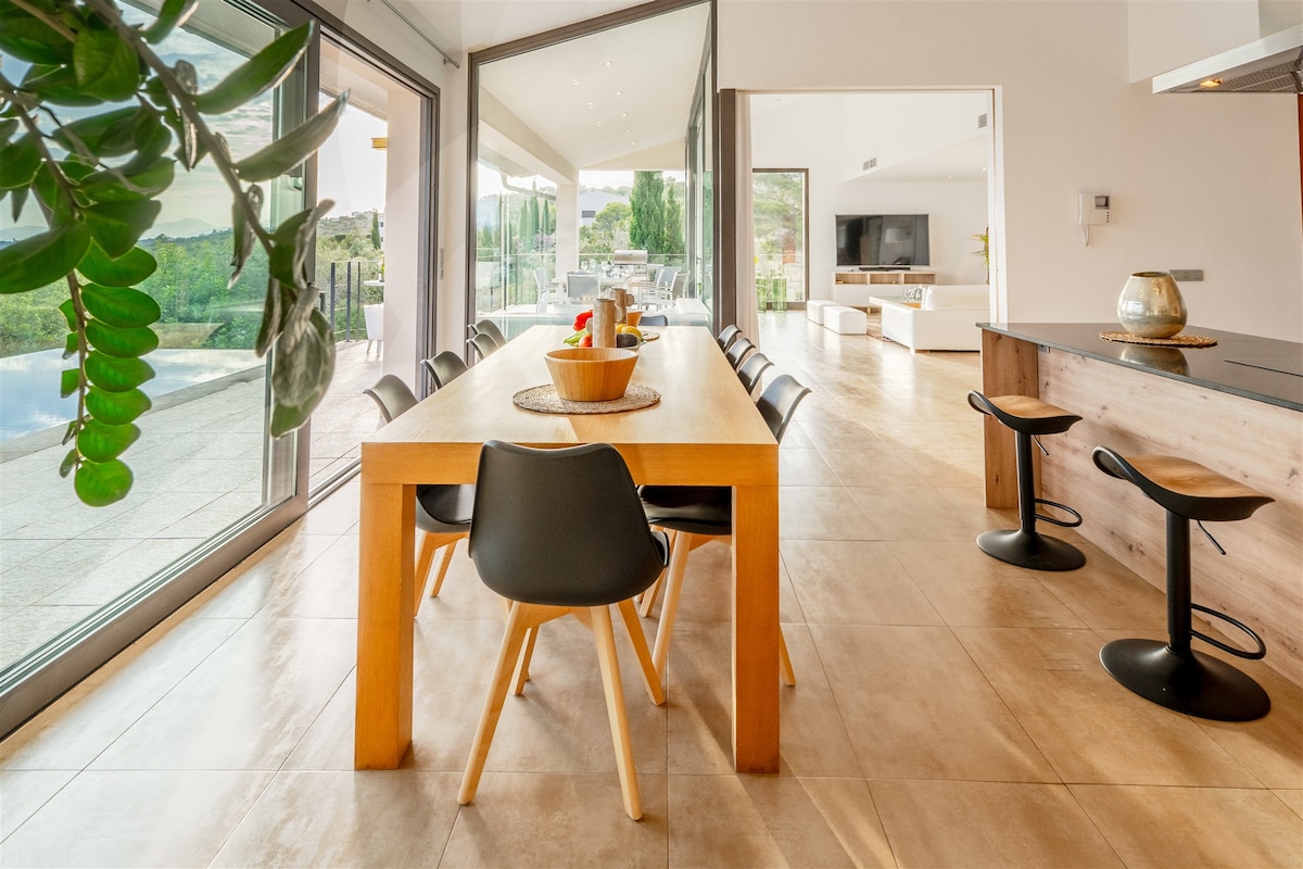 Moderne luxe villa met zwembad en spectaculair panoramisch uitzicht op de baai van Palma die opengaat zodra je de villa betreedt en wordt genoten van bijna elk verblijf, gelegen in een rustige en natuurlijke omgeving. Royale afmetingen waardoor de capaciteit voor twee families of een grote familie mogelijk is. Bij het Infinty-Pool Zwembad kunt u bij zonsondergang genieten in de bubbeljacuzzi. De veranda bij het zwembad zorgt voor ontbijt of BBQ bij zonsondergang :)