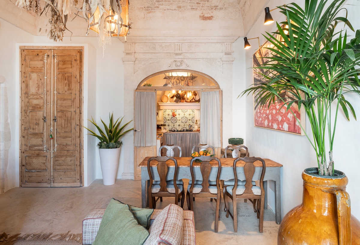 CIS: BR07401291000000188 NIN: IT074012B400033730 Ervaar het magische gevoel van tussen heden en verleden - het is een historisch huis! Vintage vloeren en stenen muren zijn de achtergrond van een omgeving ingericht met designobjecten, oud keramiek en lokale meubels. Het grote privéterras, met solarium en warme douche, zal je opwinden: je kunt ontspannen met een glas wijn bij zonsondergang, genieten van de zon op comfortabele ligstoelen of een diner bereiden in een magische Apulische sfeer.
