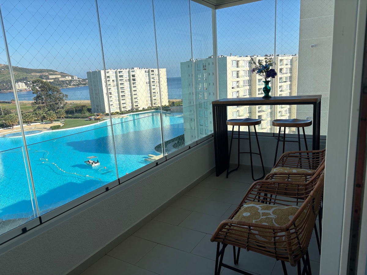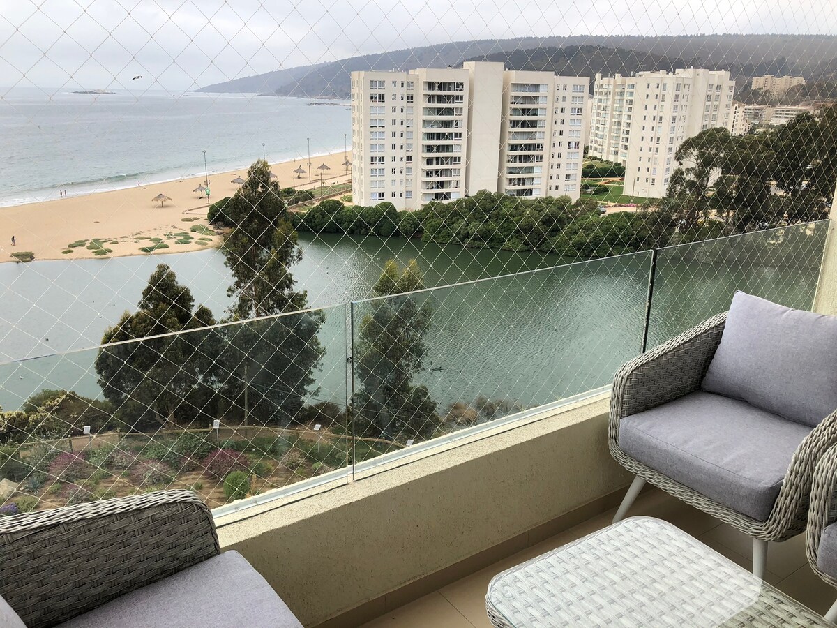 Terraza con linda vista al mar, humedal y protección para niños. 2 habitaciones, 2 baños. Salida directa a la playa. TV Cable HD, WIFI 600 MB y opción de Streaming. Cancha de Tenis, fútbol, juegos infantiles, y estacionamiento. Laguna con Kayak (solo fin de semana en temporada baja) + 3 Piscinas (solo verano) . Pequeña parrilla eléctrica en terraza. Tiene 1 estacionamiento, no se admiten mascotas. Sábanas y toallas opcionales con costo.