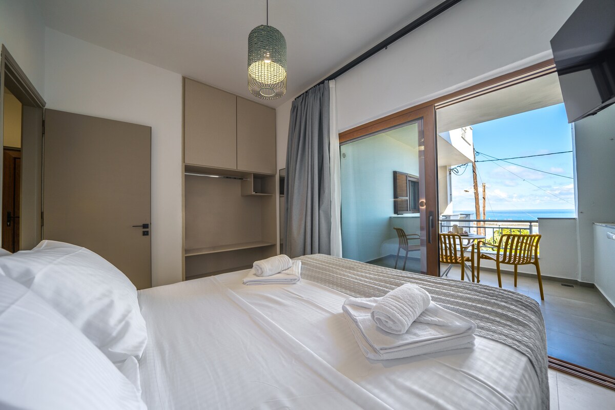 Situated in such a convenient location in the heart of the island that you will experience all that Crete has to offer, Glaros beach apts features this luxurious apartment with amazing sea view. It's a two-room apt withthe living room and kitchen in one area and the bedroom in the other, with a double bed and private terrace with breathtaking sea view! It's well equipped with AC,TV,wifi,coffee machine,kettle,fridge,hairdryer,bath amenities & linens.Panormo is a quiet area with restaurants &shops