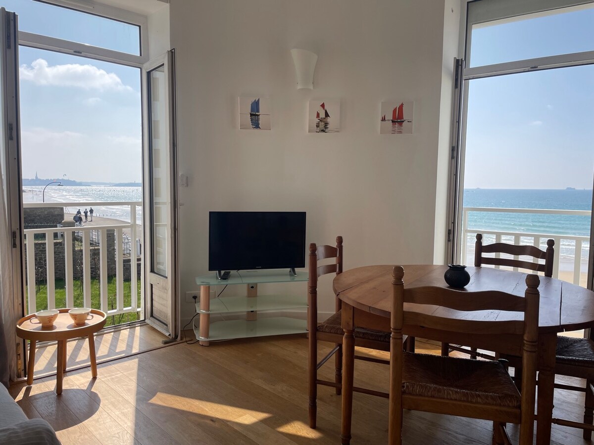 Charmant appartement onlangs gerenoveerd in villa 1900 op het strand. Rechtstreeks toegang tot het strand aan de tuin. 20 meter van de thermale baden van Saint-Malo (Thermes Marins). De muren van Saint-Malo liggen op loopafstand van een prachtige promenade aan zee. Adembenemend uitzicht op de eilanden rondom Saint Malo. Unieke positie om de bewegingen van de boten te observeren en de watersportactiviteiten te beoefenen (zeil- en surch school op 100 m).