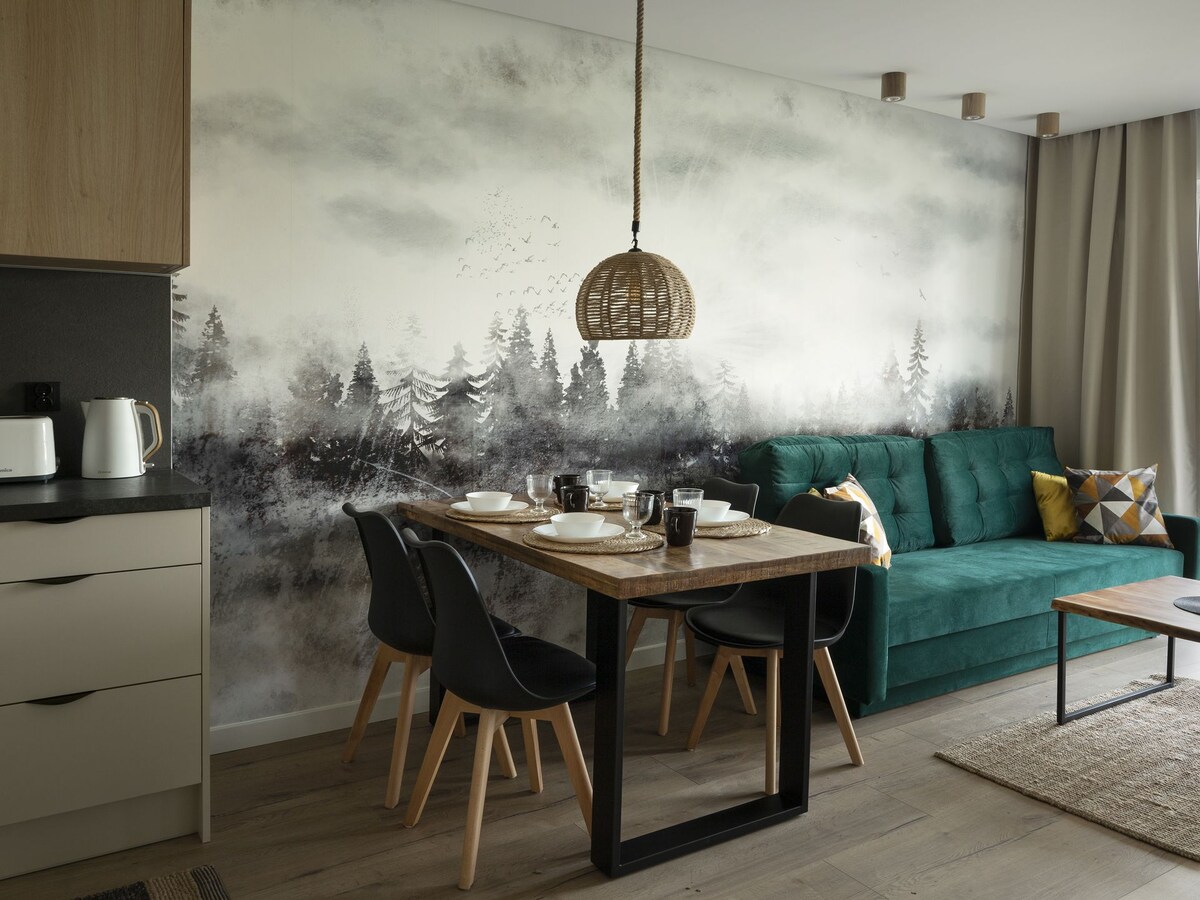 Dit appartement is een combinatie van een geweldige locatie, luxe voorzieningen en comfort. Als u een plek nodig heeft om te werken, heeft u hier hetzelfde comfort als op kantoor. Als u wilt ontspannen, is er een comfortabele leren bank met een grote tv en betaalde programma's of een hoogwaardig tweepersoonsbed. U kunt hier comfortabel koken in een moderne keuken en aan de eettafel zitten. Daarnaast een elegante badkamer, ruime kleedkamer, terras en eigen parkeerplaats direct naast het huis, gratis en zonder stress. Er is een prachtig bos met fietspaden in de buurt.