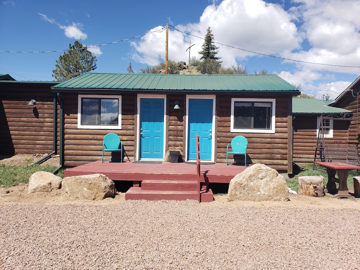 Welcome to Lake George, CO! There is lots to do: fish, hike, off-road, rock hound, and tube. We're located near Eleven Mile Canyon/Reservoir, Happy Meadows, Mueller State Park, and Cripple Creek. All cabins have a kitchenette, bathroom, and a small living/bed area. They are equipped with kitchen essentials. Cabin 3, 'Long Haul to Whee,' has the largest kitchen (with an oven). As in all the cabins, the bathroom came later. In this one, it's a little more obvious. It has one queen bed.