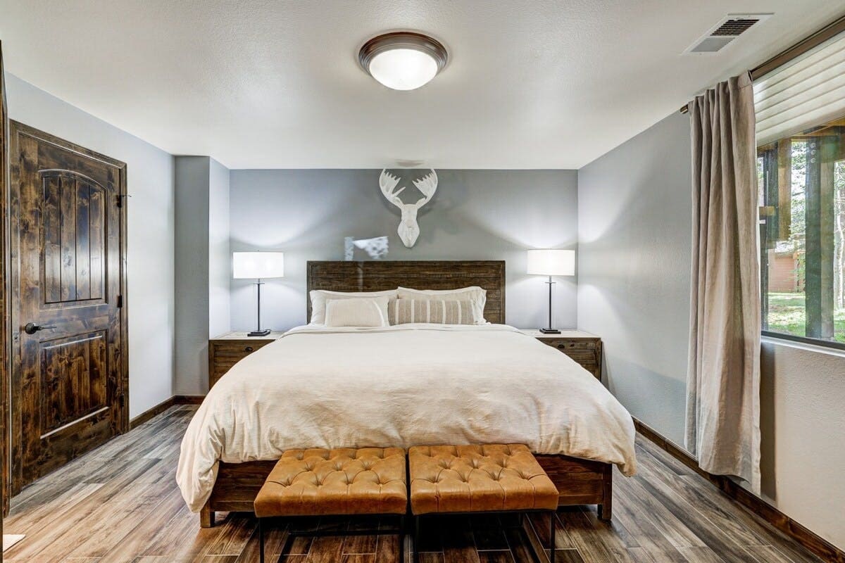 LOCATIE, LOCATIE, LOCATIE!! We zijn 3 blokken verwijderd van Main Street en 2 van Peak 9 liften! De Freeride-bus stopt aan beide kanten van de accommodatie en rijdt om de 15 minuten. Wandel- en wandelpaden zijn in onze buurt ook ruimschoots aanwezig. Onze accommodatie is een 2 verdiepingen tellende 2br/2ba volledig gemeubileerd en volledig bijgewerkt met voldoende privacy voor je reis. De achtertuin biedt een wijd open, vrij uitzicht op de bergen met weilanden, vijvers en de Blauwe Rivier. Er is geen betere plek om in Breck te zijn!