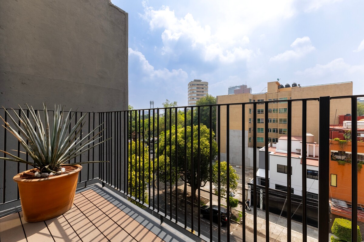 Moderne loft met balkon en uitzicht op Parque Mexico