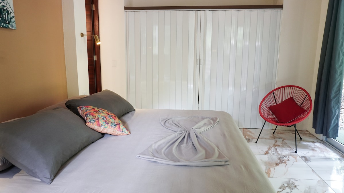 De kamer heeft een queensize bed, airconditioning, tv met vuurstok om toegang te krijgen tot streamingdiensten met je eigen account (geen tv-kabel) en een eigen badkamer. De eigen kleine keuken is voorzien van alles wat je nodig hebt voor eenvoudige maaltijden. Gelegen aan een klein strand, voor de hoofdweg, op 300 meter van het strand en de supermarkt, op 4 km van het centrum van Puerto Viejo en op 2 km van Punta Uva. Privé parkeerplaats aanwezig. Trots Costa Ricaans🇨🇷