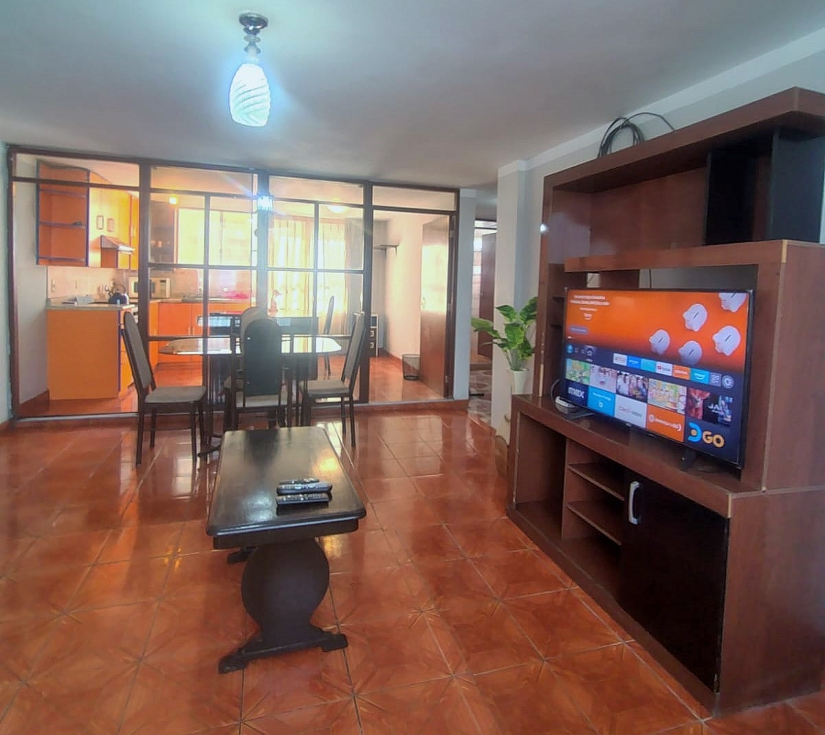Geniet van een veilige, comfortabele en stijlvolle ervaring, dicht bij het centrum van Arequipa. Modern appartement met eigen ingang en digitaal slot. ✨ Wat het biedt: 1 slaapkamer met queensize bed, verlichte inloopkast, werkruimte. Volledig uitgeruste keuken: koelkast, oven, koffiezetapparaat, blender, volledige set borden. Badkamer met warm water, haardroger en strijkijzer. Grote kamer met 65” Samsung-tv + Netflix, Disney+, Prime Video. Patio met wasmachine en -droger.